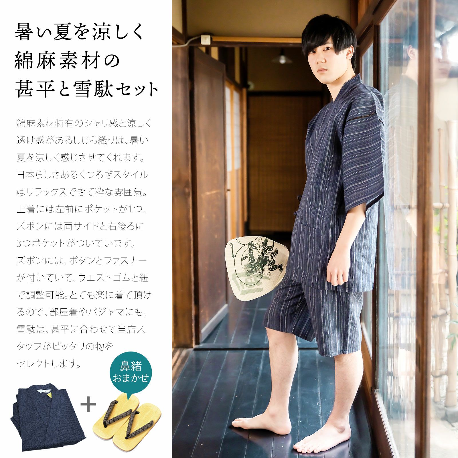 【商品内容】甚平1点(上着とズボンのセット)と雪駄(鼻緒柄おまかせ)の2点セット