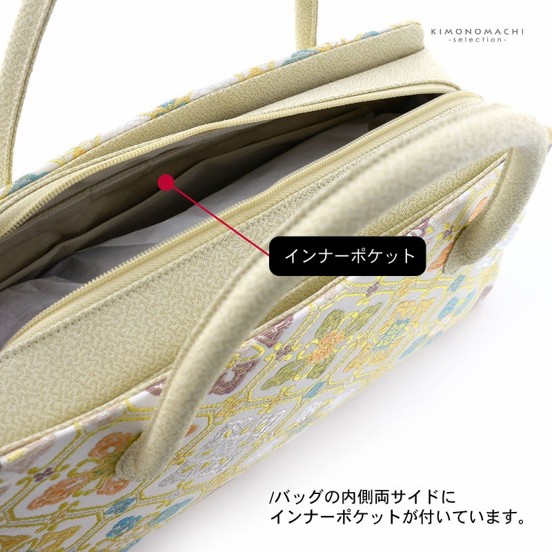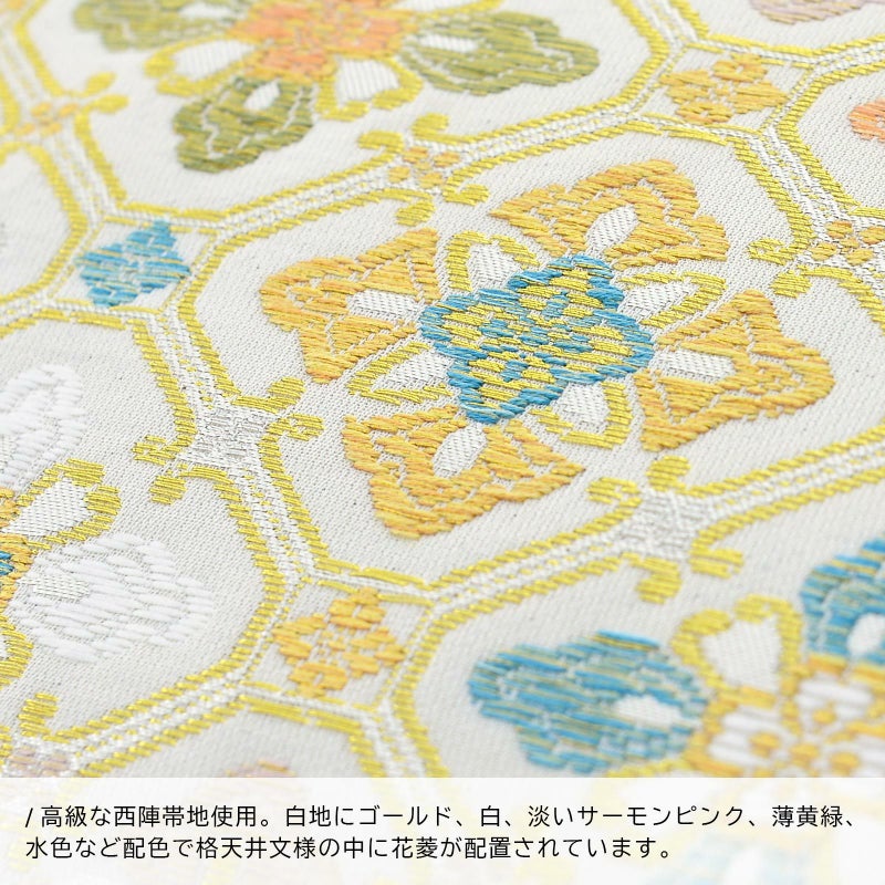 【色柄】バッグの表裏は白地にゴールド、白、淡いサーモンピンク、薄黄緑、水色など配色で格天井文様の中に花菱が配置されています。バッグの持ち手、側面は細かな地模様のある黄みのベージュ。底にゴールドの鋲。