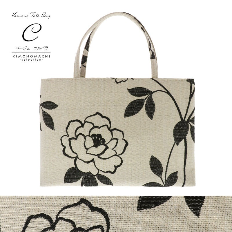 C.ベージュ ツルバラ:ざっくりとした風合いのあるベージュの地に黒で表現されたつるバラのようなお花と蔓草。内張りは黒。