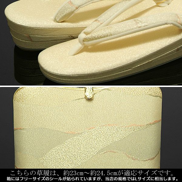【品質】表地:絹80%、ポリエステル金糸20%/草履裏:本革使用/花緒裏:ナイロン本天