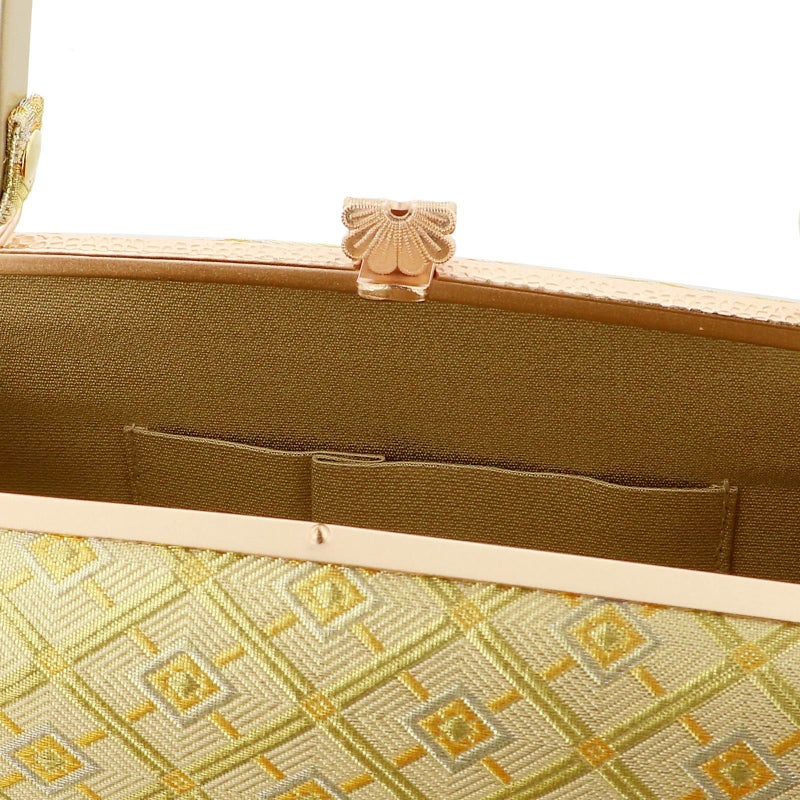 バッグの表裏、草履の鼻緒、台は、ゴールドの格子を基調にイエローゴールド、シルバーの菱を組み合わせた文様。