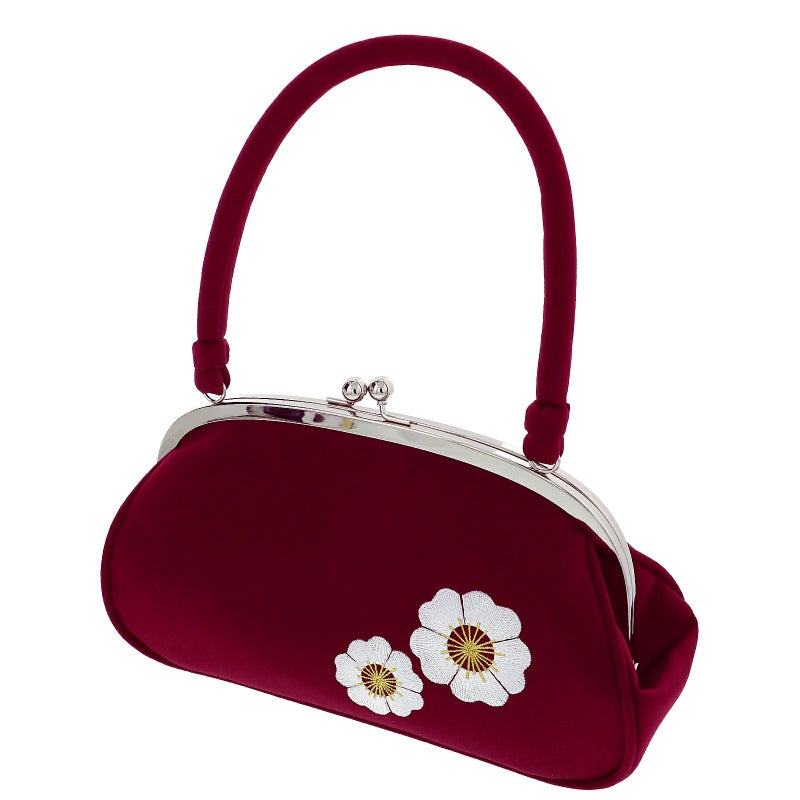 バッグの持ち手と本体は深紅色の地。華やかな白の刺繍で表現されたお花は、表は厚物菊、裏は梅の花。葉脈や蕊のゴールドがアクセントになっています。