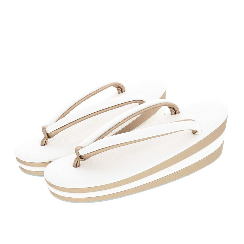 【カラー】バッグの表裏、持ち手の表はややマットなベージュゴールド。側面、持ち手の裏はオフホワイト。口金は明るいゴールド。草履の鼻緒は白。鼻緒の裏と前坪はベージュゴールド。草履の台は白の天に、三枚芯の巻はベージュゴールドと白。エンボス加工によって全体に皮革のきめが表現されており、やわらかい奥行きのある質感です。
