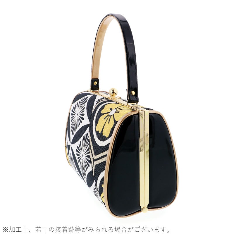 バッグの表裏、草履の鼻緒は、黒地にゴールドの大きな亀甲、イエローゴールドの剣桜文と、白地に黒の七宝、花菱の文様。バッグの持ち手や側面はつややかな黒。ブロンズの縁取り。草履の台は、つややかな黒の天、芯の巻はブロンズ。