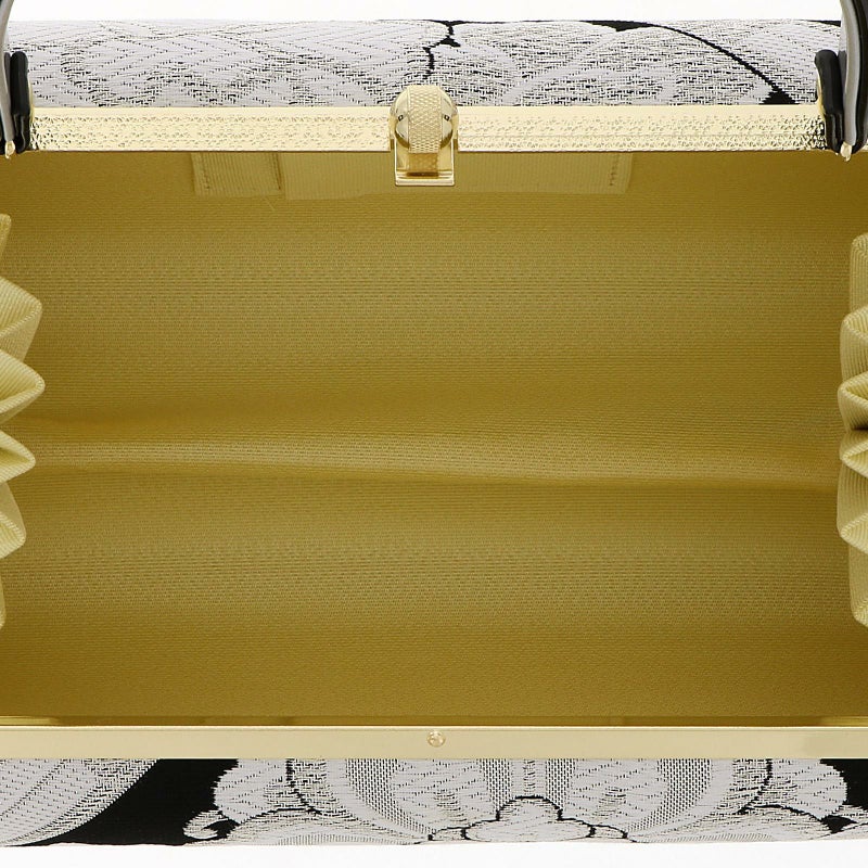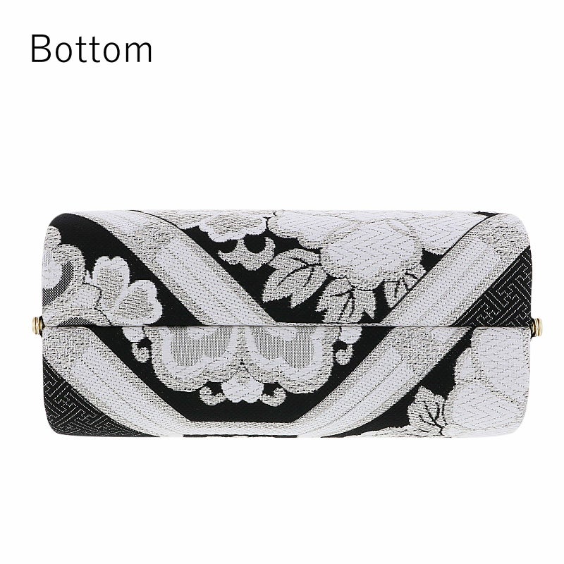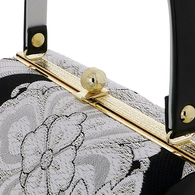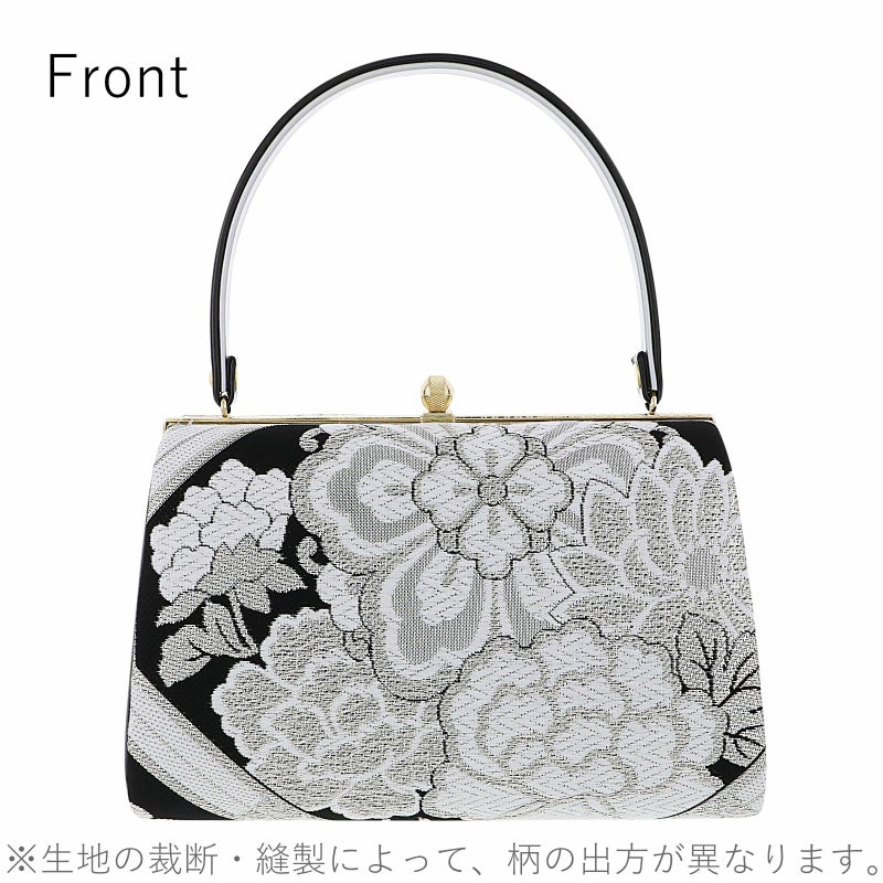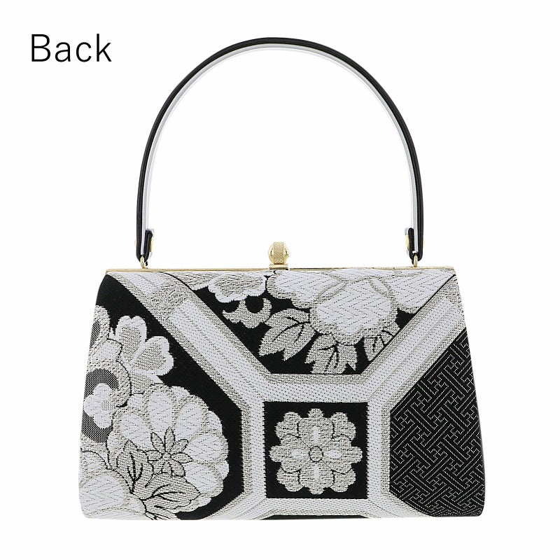 【色柄】バッグの表と裏は、黒地に白とシルバーの蜀江文様に牡丹や四季の花。持ち手は黒にグレーの裏。口金は明るいゴールド。草履の鼻緒はバッグと共生地の蜀江に花。前坪はグレー。草履の台は、黒の天に、グレーの半月、黒の芯の巻き。