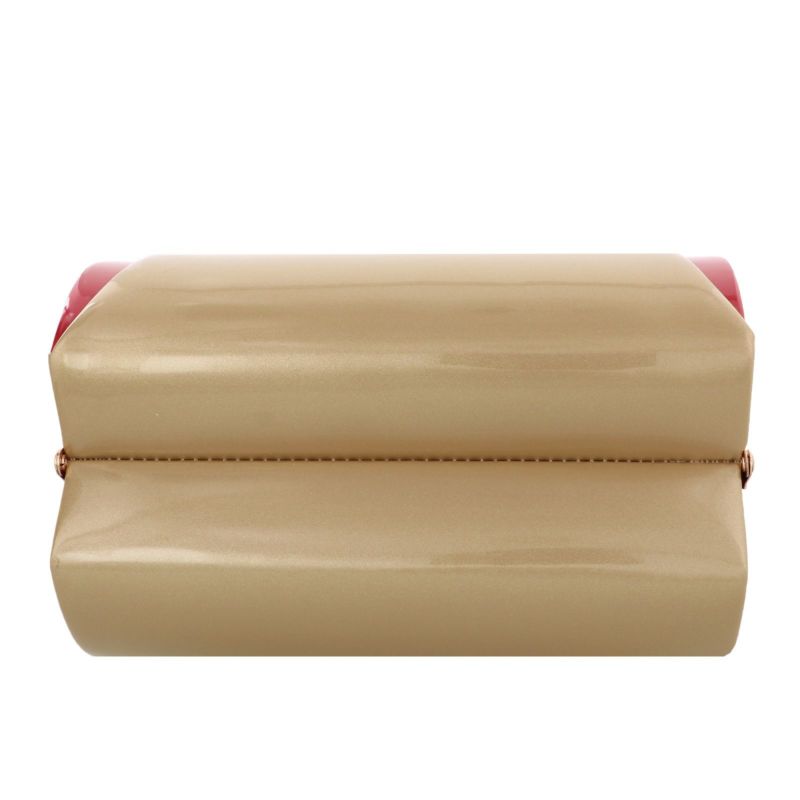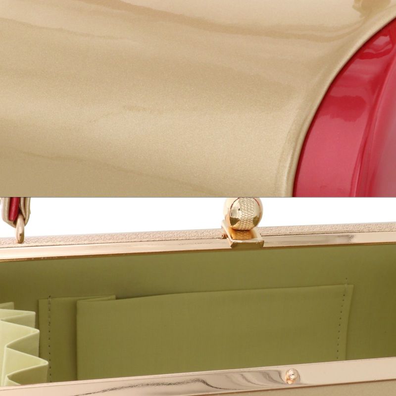 【カラー】バッグの裏表、草履の台はやや沈んだおちついたゴールド。バッグ側面、鼻緒は鮮やかな赤。表の両サイドに赤をのぞかせたデザインが格好良く、シンプルながら個性が光ります。バッグの持ち手は表ゴールド、裏赤。