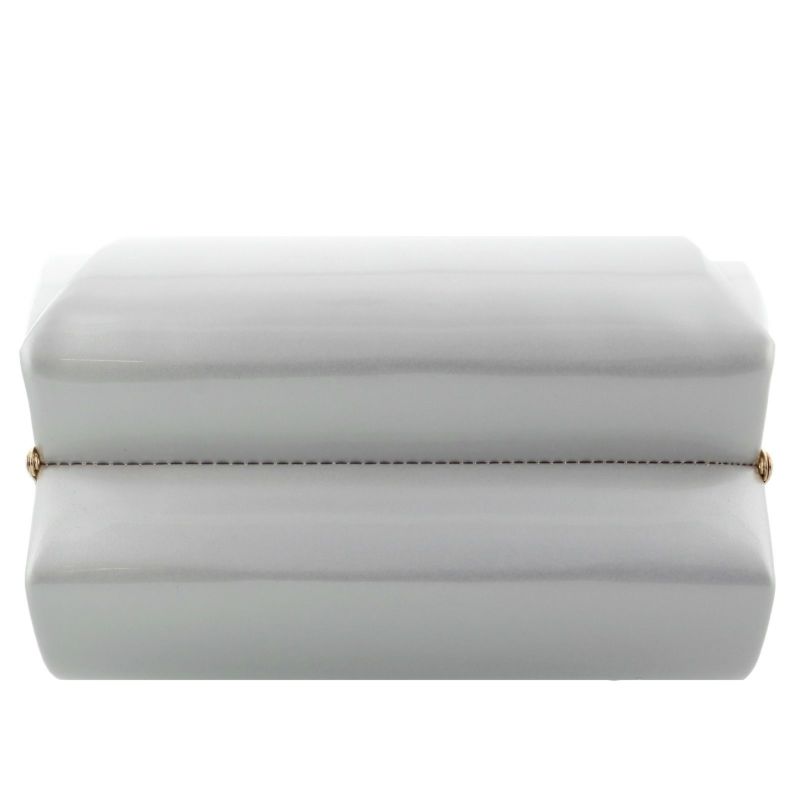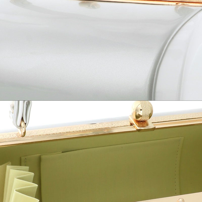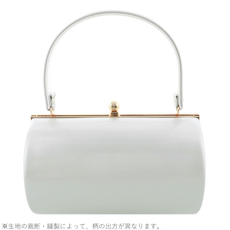 【カラー】バッグの裏表、草履の台はつやのあるシルバーグレー。バッグ側面、鼻緒は白。表の両サイドに白をのぞかせたデザインが格好良く、すっきりとスタイリッシュな雰囲気。バッグの持ち手は表シルバー、裏白。