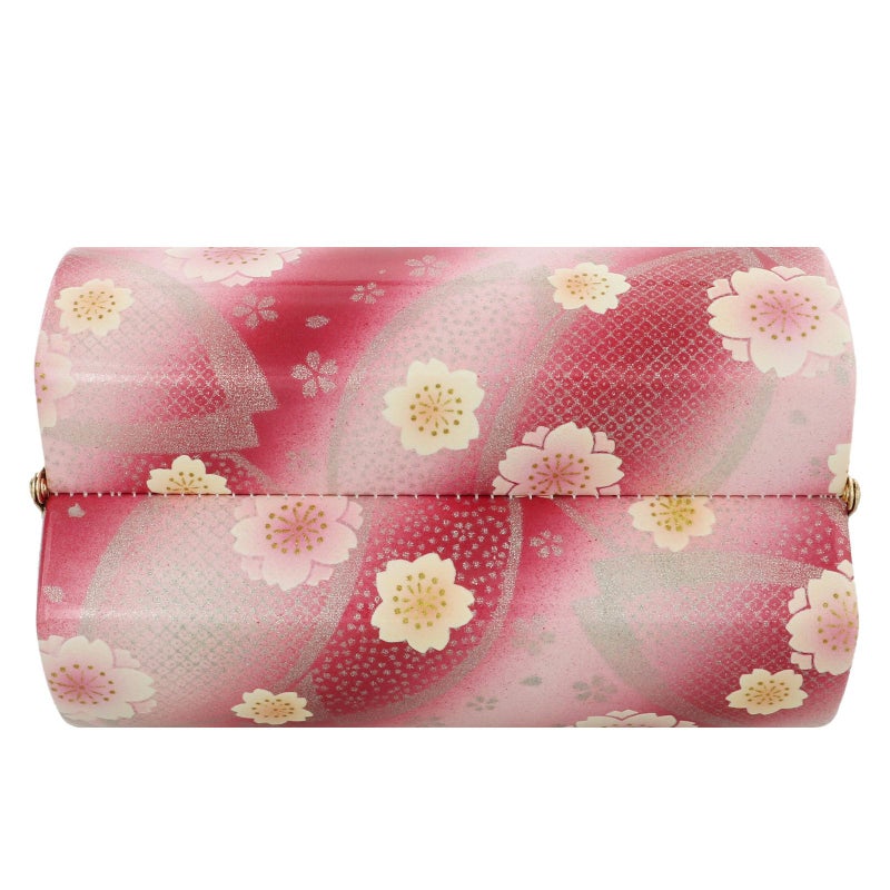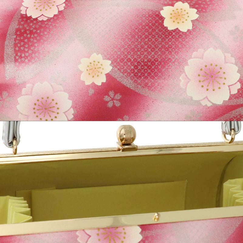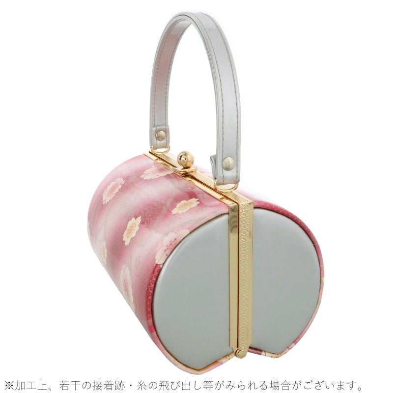 【カラー】バッグの表裏、草履の鼻緒は淡いピンクにルビーレッドの斜めぼかしの地。ラメ感のあるシルバーの大きな桜のシルエット。白にピンクやコーラルの八重桜の花模様。バッグ側面、持ち手はシルバーグレー。草履の台は落ち着いた銀色。