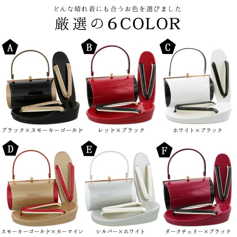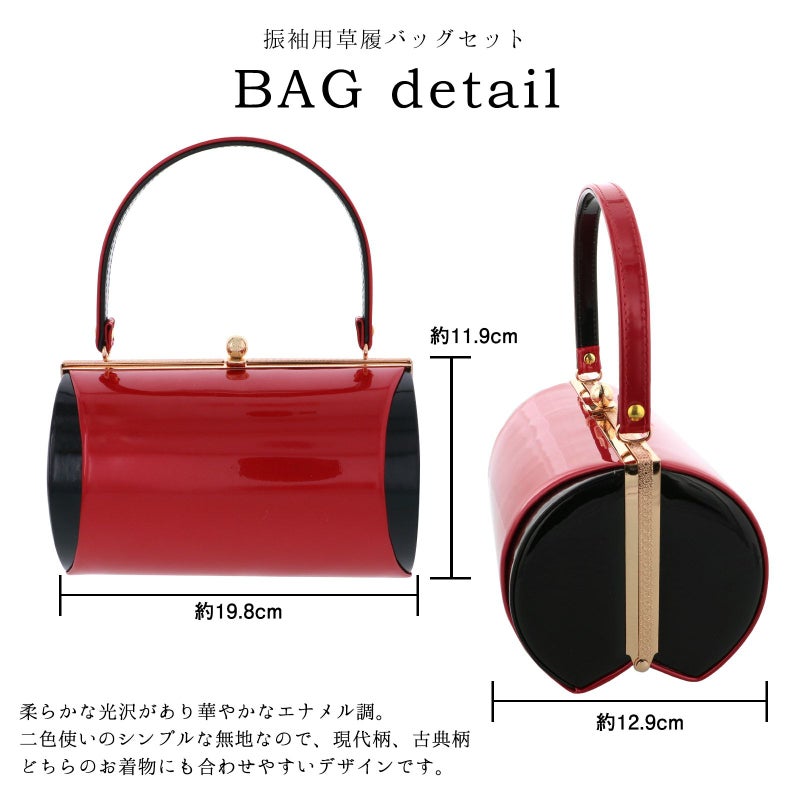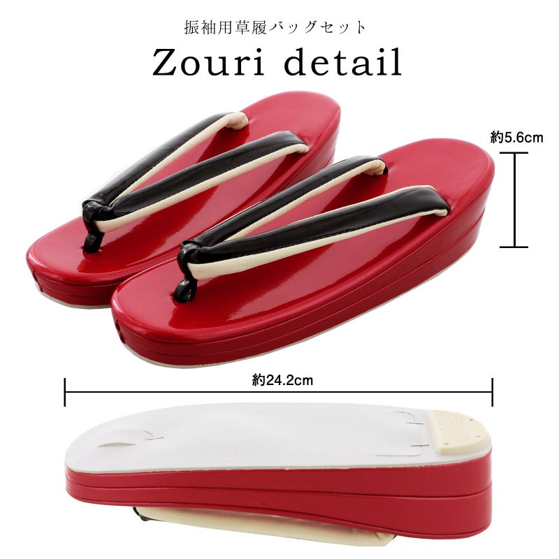 バッグの裏表、草履の台はつややかな深い赤。バッグ側面、鼻緒は黒。表の両サイドに黒。バッグの持ち手は表赤、裏黒。