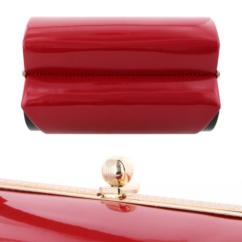 バッグの裏表、草履の台はつややかなダークレッド。バッグ側面、鼻緒は黒。表の両サイドに黒をのぞかせたデザインが格好良く、シンプルながら個性が光ります。バッグの持ち手は表は濃赤、裏黒。