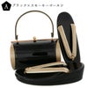 バッグの裏表、草履の台はつややかな黒。バッグ側面、鼻緒はやや沈んだおちついたゴールド。表の両サイドにゴールド。バッグの持ち手は表黒、裏ベージュ。