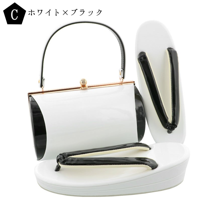 バッグの裏表、草履の台は滑らかな白。バッグ側面、鼻緒は黒。表の両サイドに黒。バッグの持ち手は表白、裏黒。