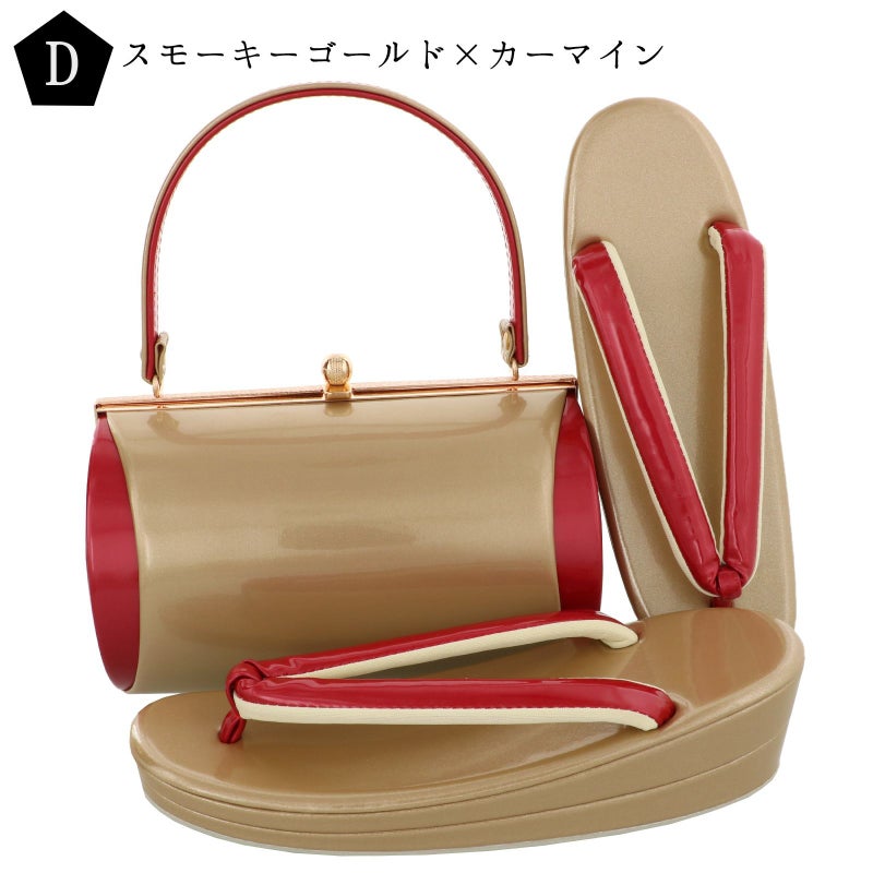 バッグの裏表、草履の台はやや沈んだおちついたゴールド。バッグ側面、鼻緒は鮮やかな赤。表の両サイドに赤。バッグの持ち手は表ゴールド、裏赤。