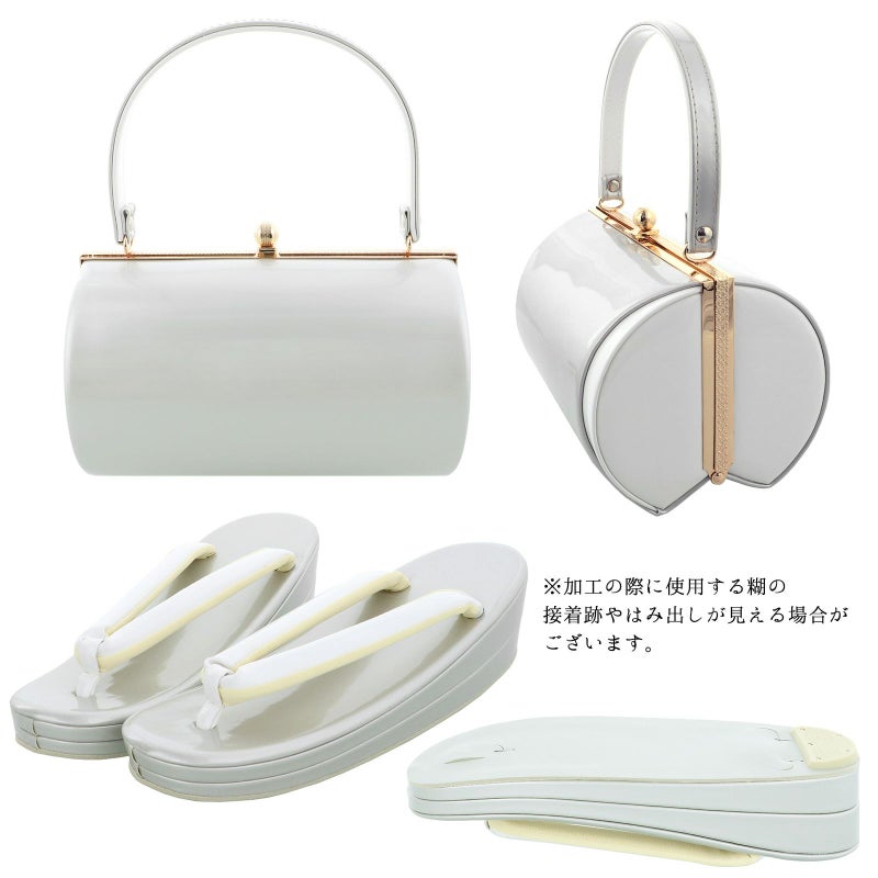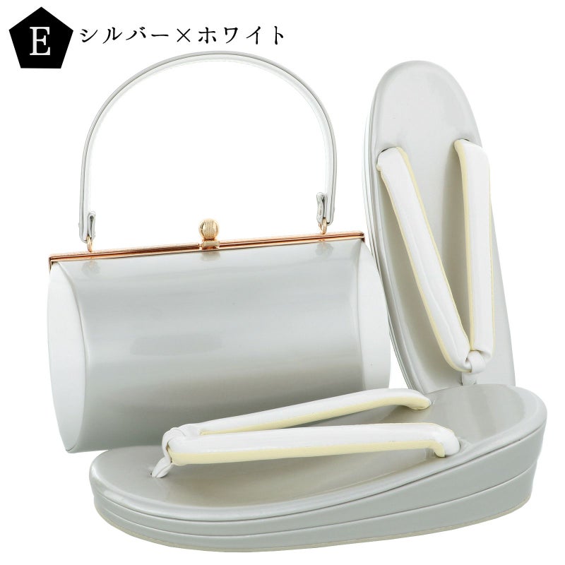 バッグの裏表、草履の台はつやのあるシルバーグレー。バッグ側面、鼻緒は白。表の両サイドに白。バッグの持ち手は表シルバー、裏白。