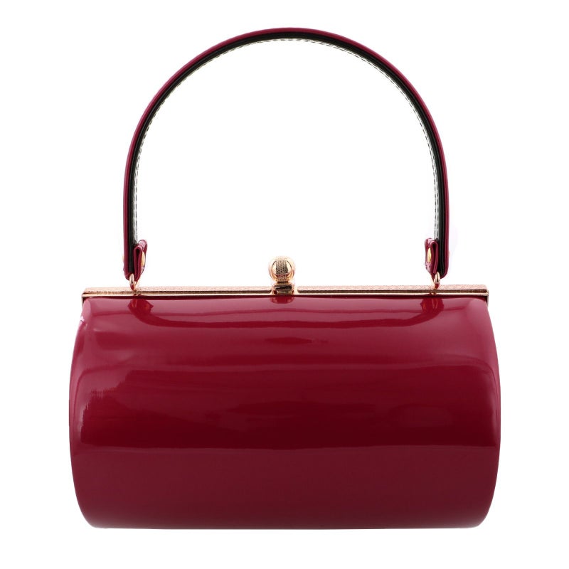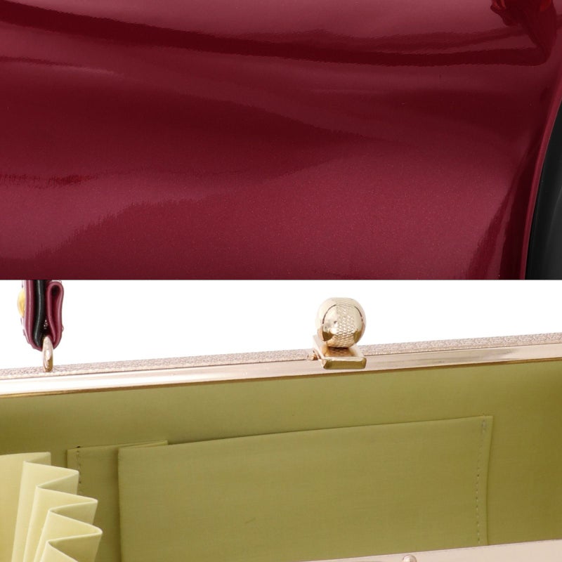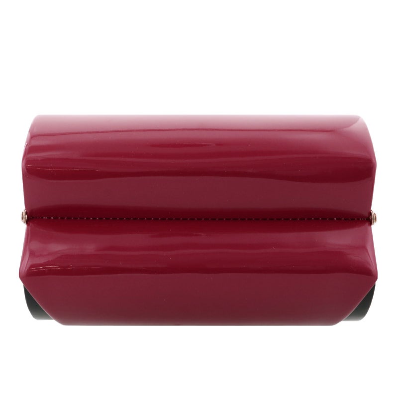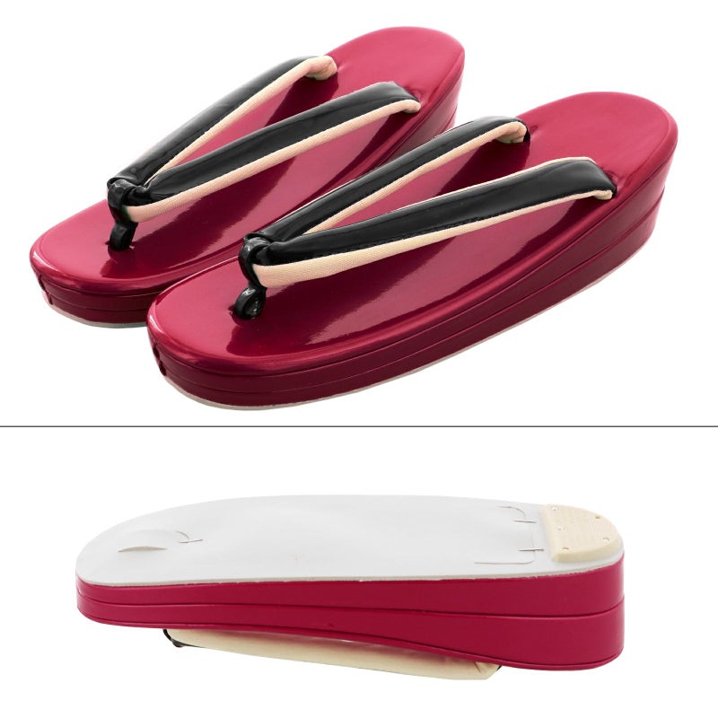 【カラー】バッグの裏表、草履の台はつややかなダークレッド。バッグ側面、鼻緒は黒。表の両サイドに黒をのぞかせたデザインが格好良く、シンプルながら個性が光ります。バッグの持ち手は表は濃赤、裏黒。