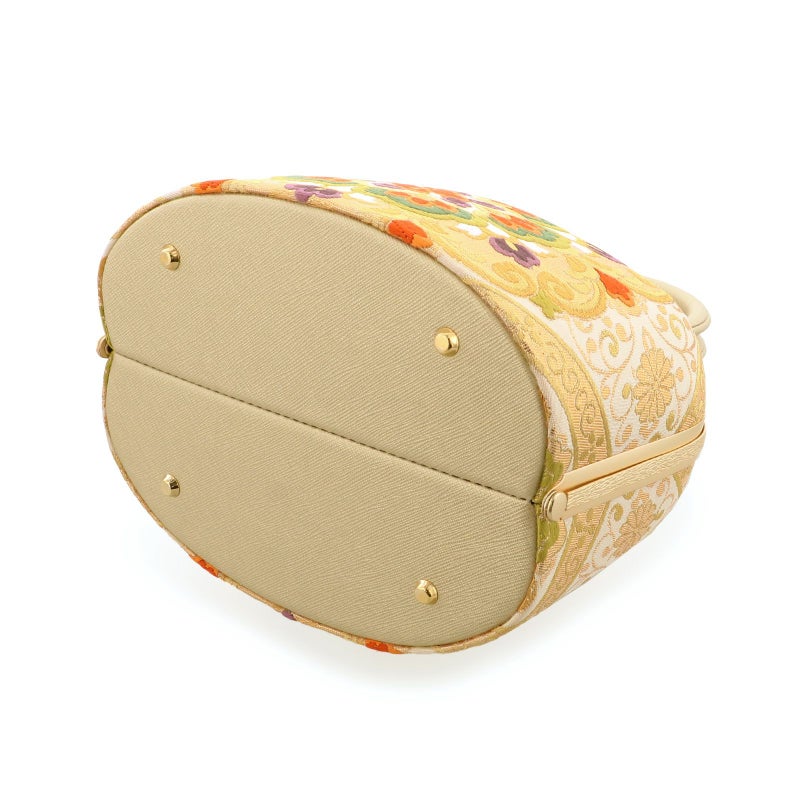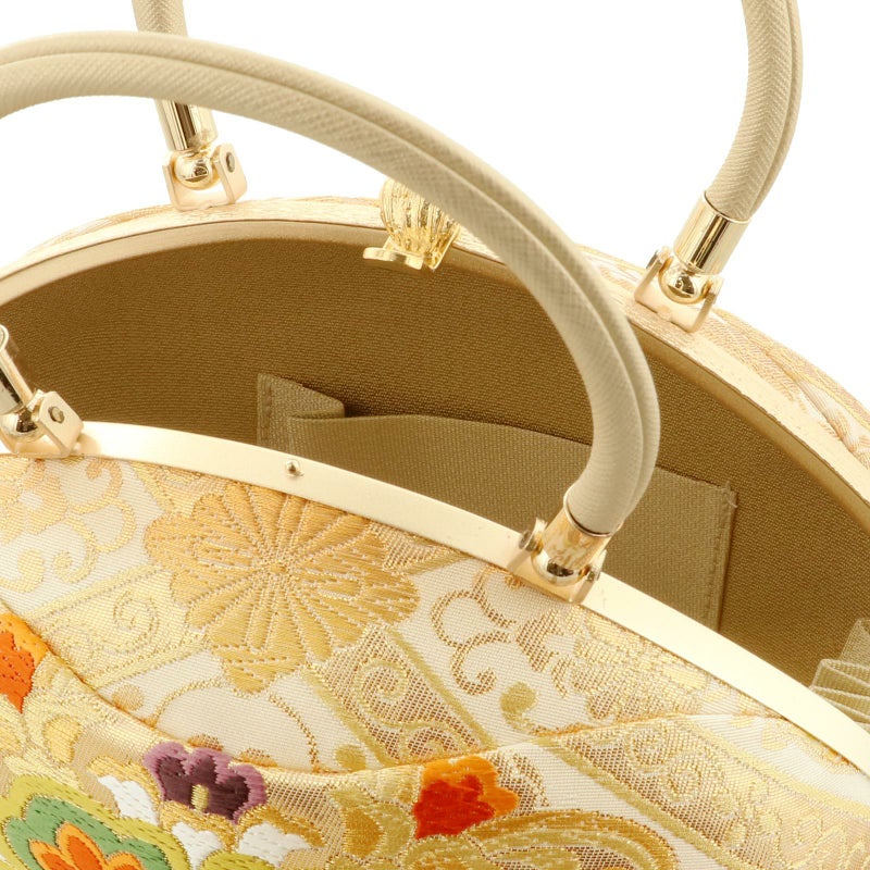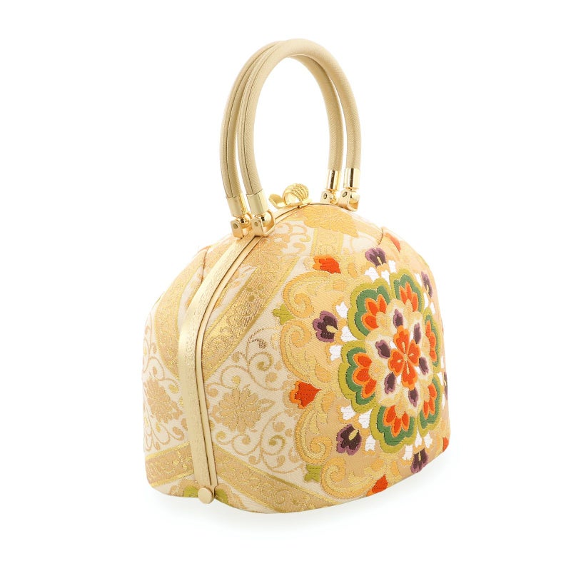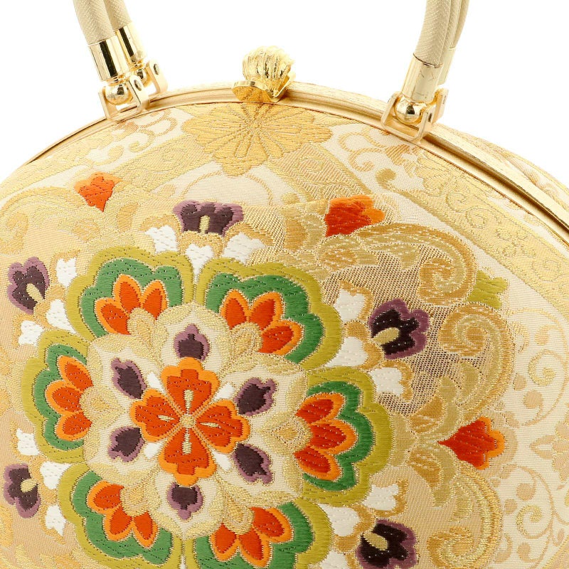 【カラー】バッグの本体は、象牙色地にゴールドの菊菱格子、菊唐草。白、橙色、深緑色に紫などの大きな唐華紋。切り替えのデザインと唐織の高級感が他にはない一品です。持ち手と口金はゴールド。草履の鼻緒はバッグと共生地。前坪はゴールド。台は浅いゴールドの五分三枚芯。ゴールドの飾り芯。