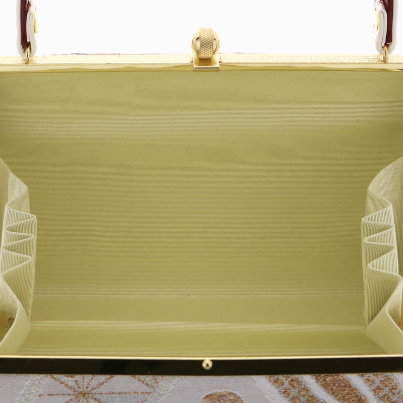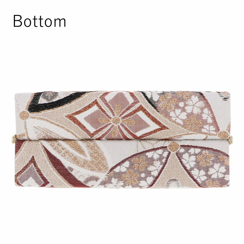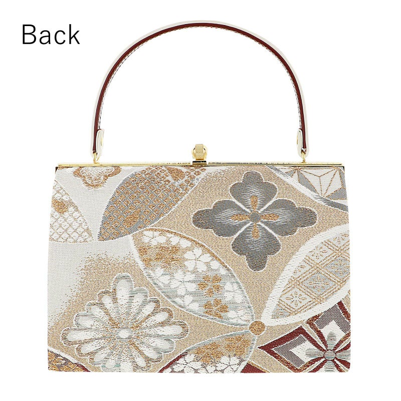 【色柄】バッグの表と裏は、白地に黒や浅い赤、ゴールドやラメで織り出された花七宝文様。持ち手は白にルビーレッドの裏。口金は明るいゴールド。草履の鼻緒はバッグと共生地の花七宝。前坪はルビーレッド。草履の台は、白の天に、ルビーレッドの半月、白の芯の巻き。
