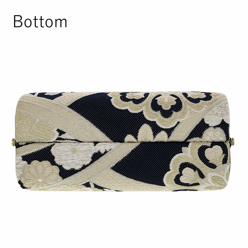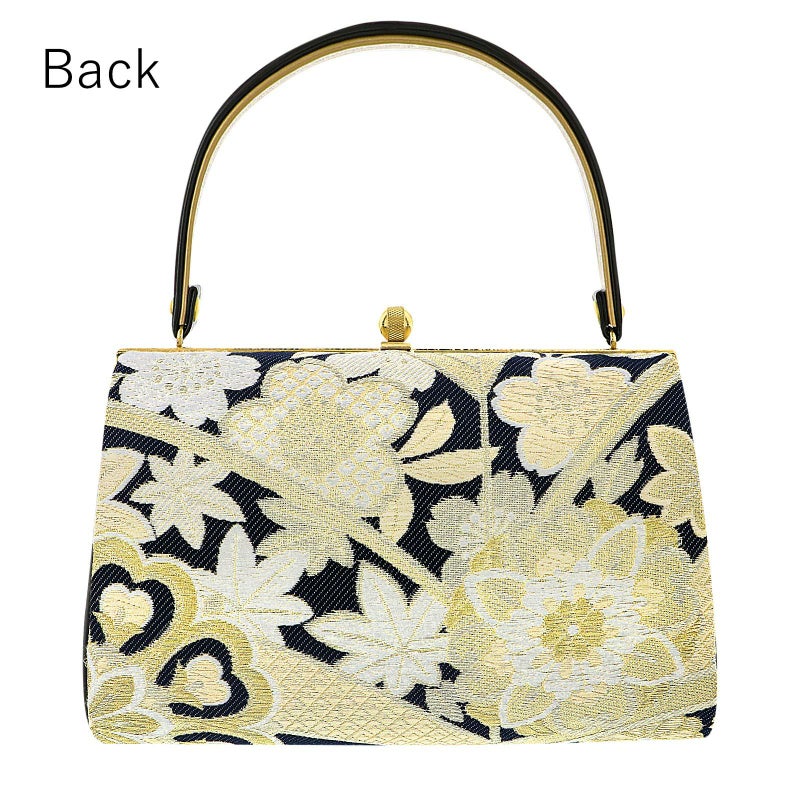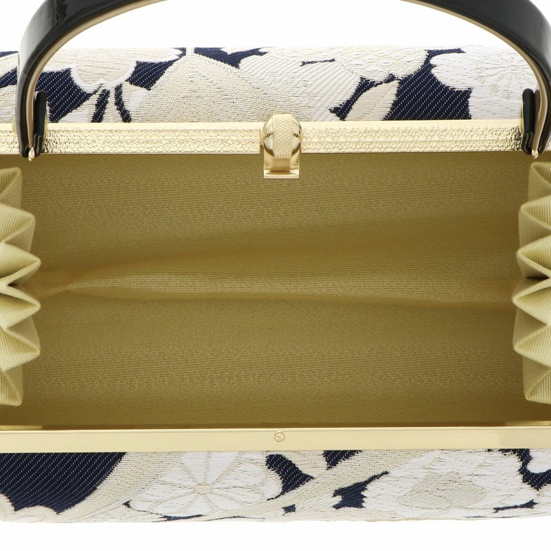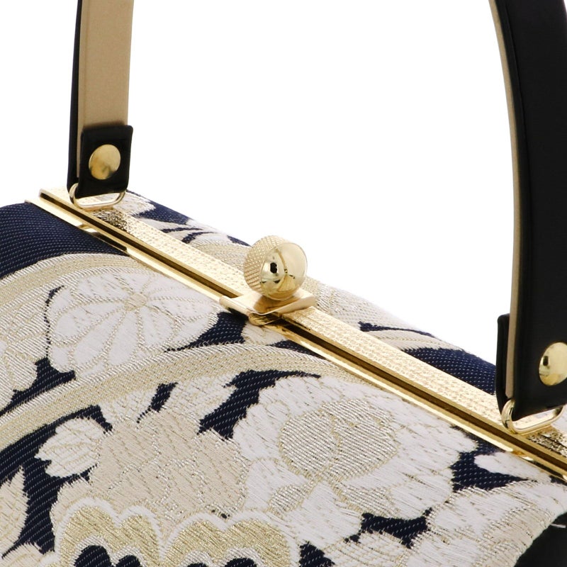 【色柄】バッグの表と裏は、紺地に白やホワイトゴールドを基調とした華紋。持ち手は黒にゴールドの裏。口金は明るいゴールド。草履の鼻緒はバッグと共生地の華紋。前坪はゴールド。草履の台は、黒の天に、ゴールドの半月、黒の芯の巻き。