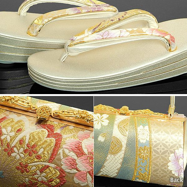 【カラー】ゴールド、紫、ピンク、水色などの色使い。バッグの大きな桜の花模様が印象的です。持ち手と側面はうろこの織地模様。金具はゴールドとピンクゴールド。草履の鼻緒はバッグと同色、同柄の生地使い、台は、シャンパンゴールド。