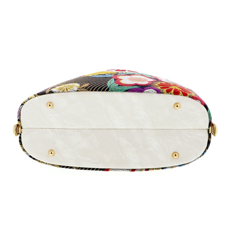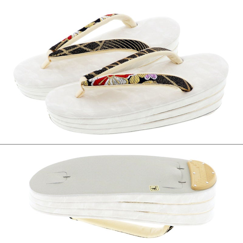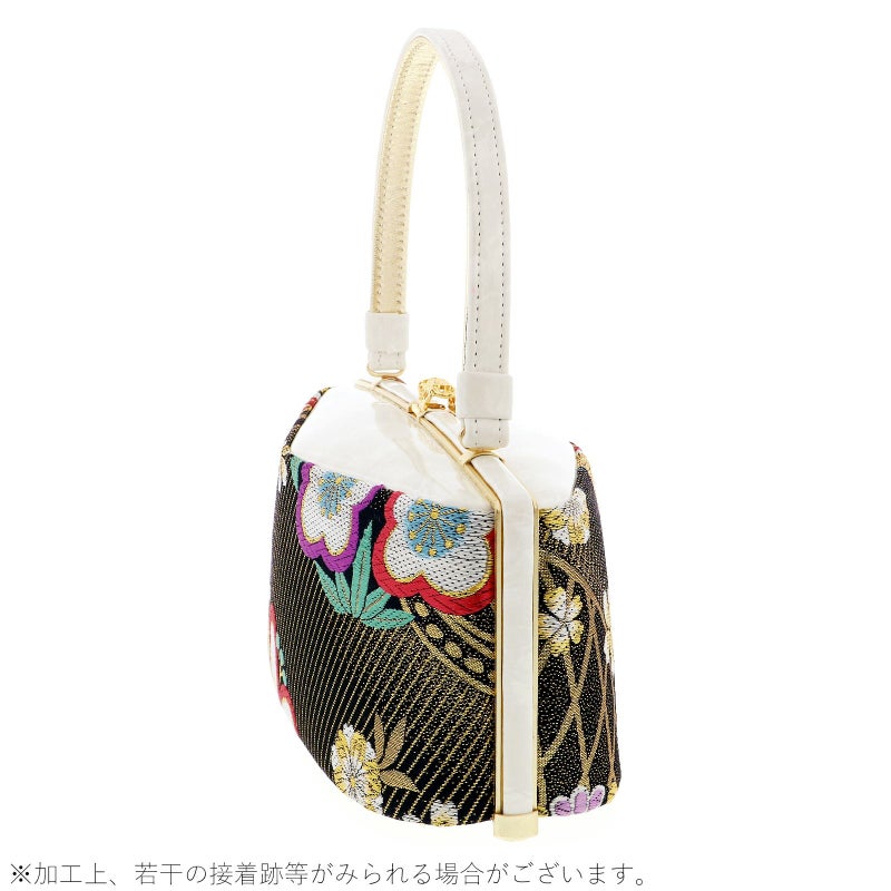 バッグの表裏、草履の鼻緒は、黒地に、イエローゴールドの手綱や格子。白、赤、金を基調に桃色、緑、青、紫などの配色の梅や菊、笹、若松や華紋。バッグの持ち手や側面、芯を3段重ねた草履の台は、パールホワイトのマーブル模様。