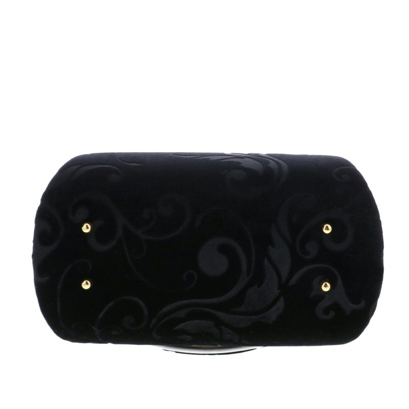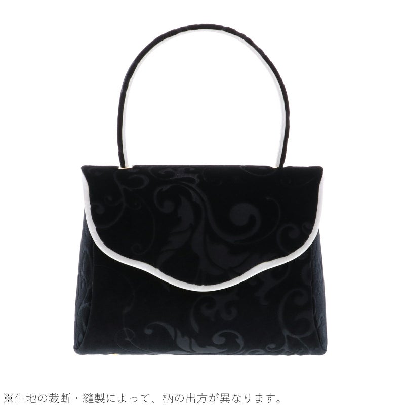 バッグの表裏、持ち手、草履の鼻緒は、黒のエンボス加工によって施された唐草模様のベルベット地。バッグの持ち手裏、蓋の縁、五分芯を3段重ねた草履の台は、パールホワイトのマーブル模様。