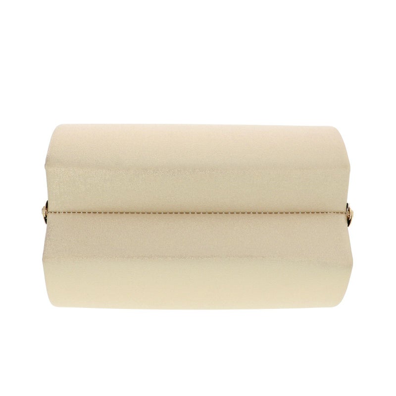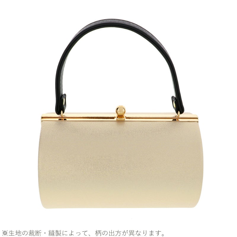 バッグの表裏は、金通しの明るいベージュ。全体的にシャンパンゴールドに輝きます。持ち手、側面はつやのある黒。口金は明るいゴールド。草履の鼻緒はシャンパンゴールド。草履の台は黒の天に、芯の巻はシャンパンゴールド。
