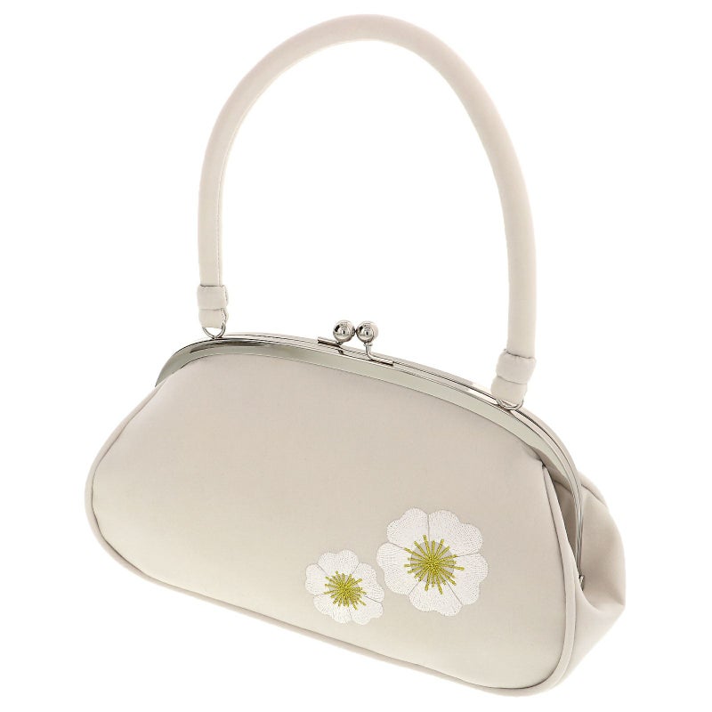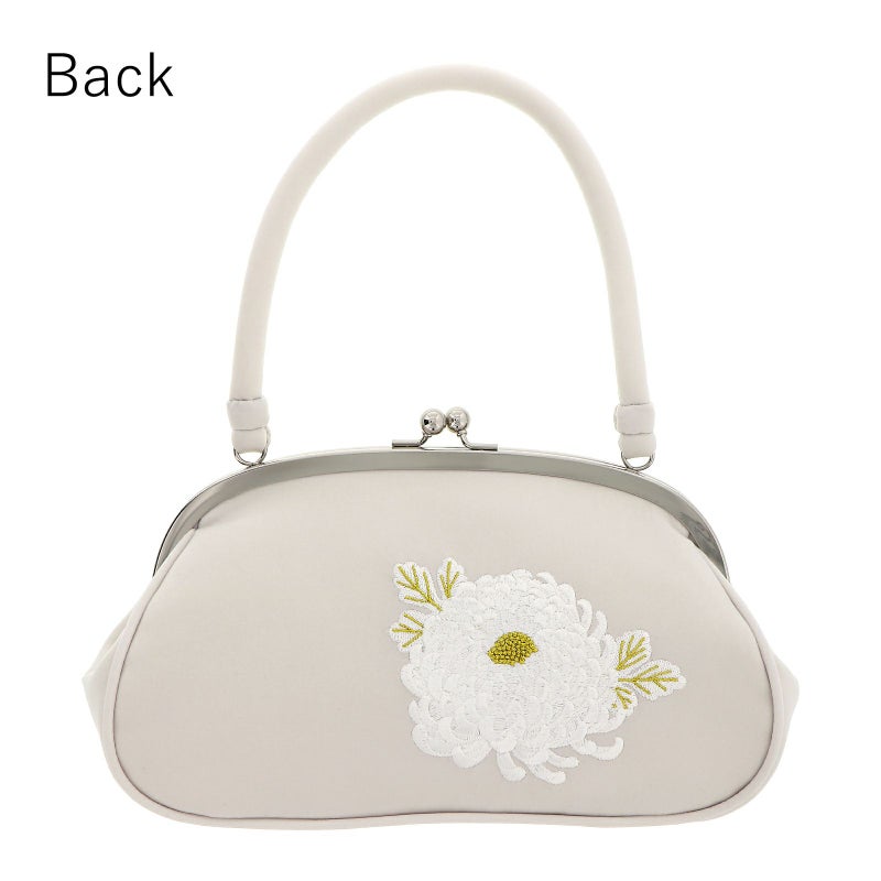 バッグの持ち手と本体はやや灰みのオフホワイトの地。優美な白の刺繍で表現されたお花は、表は厚物菊、裏は梅の花。葉脈や蕊のゴールドがアクセントになっています。