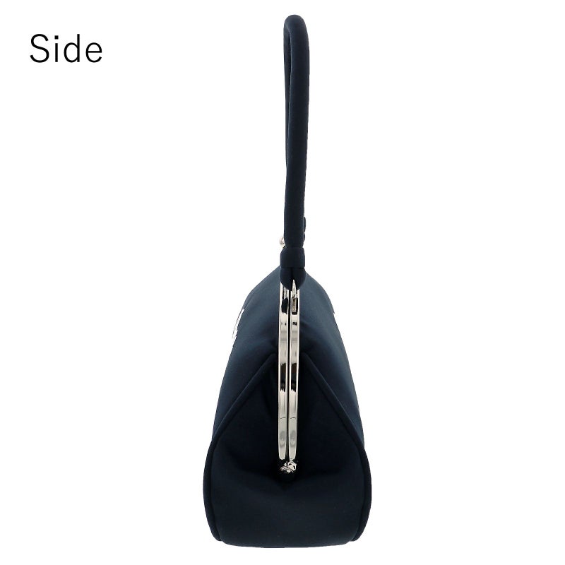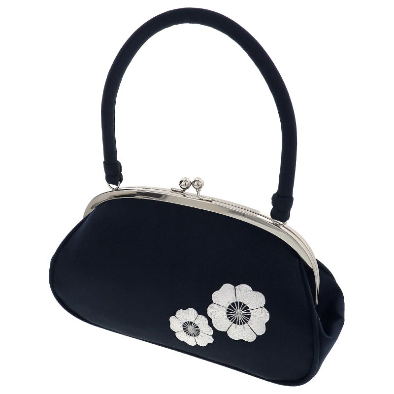 バッグの持ち手と本体は深い濃紺色の地。繊細な白の刺繍で表現されたお花は、表は厚物菊、裏は梅の花。葉脈や蕊のシルバーがアクセントになっています。