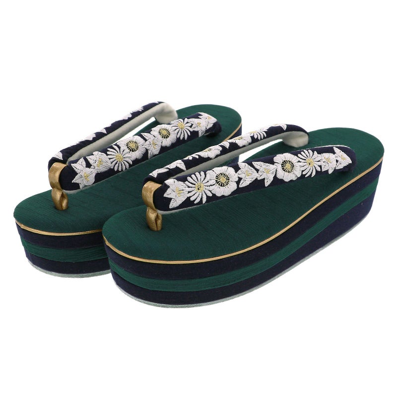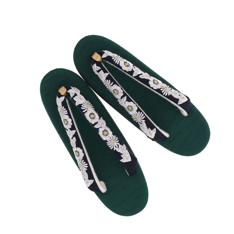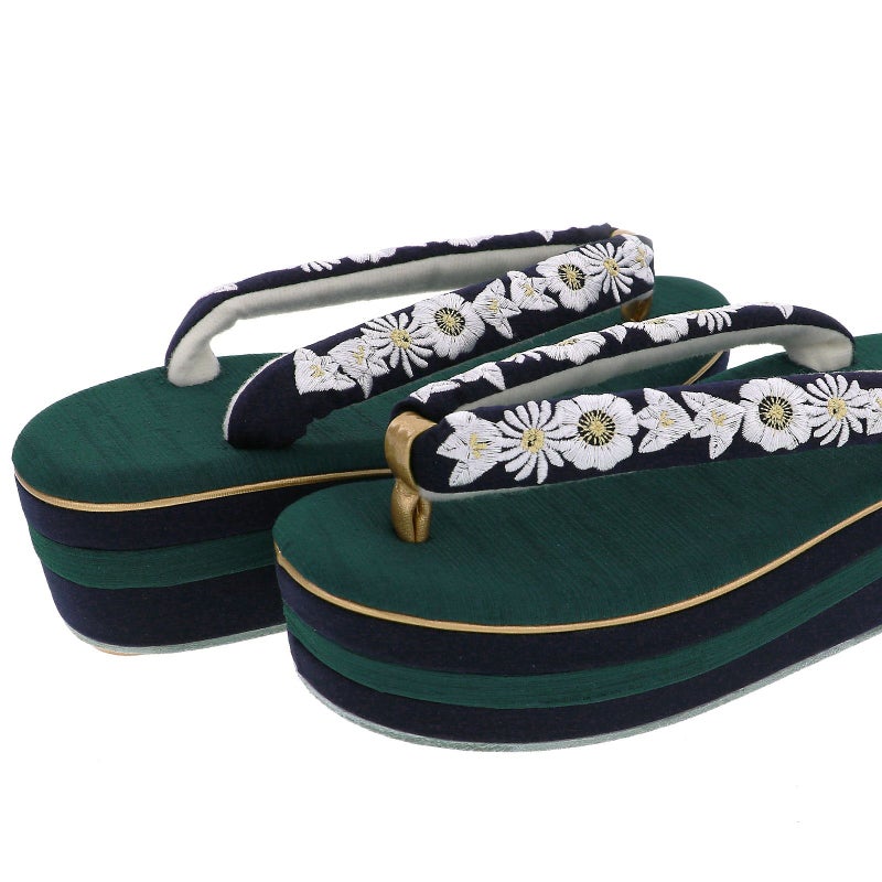 草履の鼻緒は濃紺地に白の刺繍で表現された橘や菊、梅。ポイントに淡い金茶色。前坪はゴールド。青緑色の紬のような織りの質感のある台。芯の巻きはネイビーと青緑。ゴールドの飾り芯。