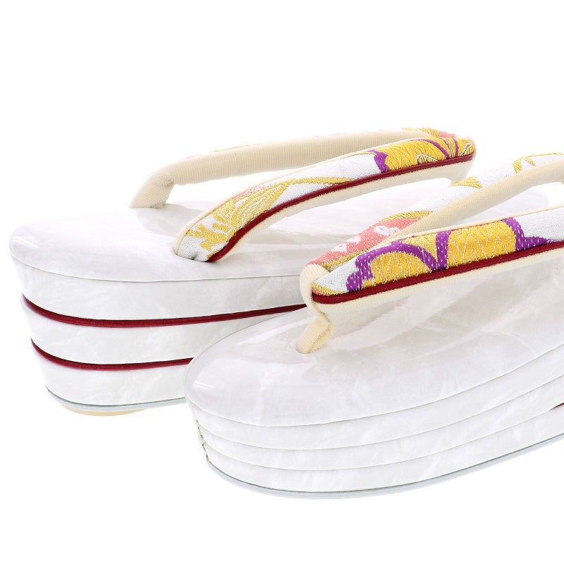 バッグの表裏、草履の鼻緒は、シルバーとピンクの霞の地に、ゴールドと赤、紫、水色の桜紋。バッグの持ち手や側面、五分芯を3段重ねた草履の台は、シャンパンゴールドのマーブル模様。