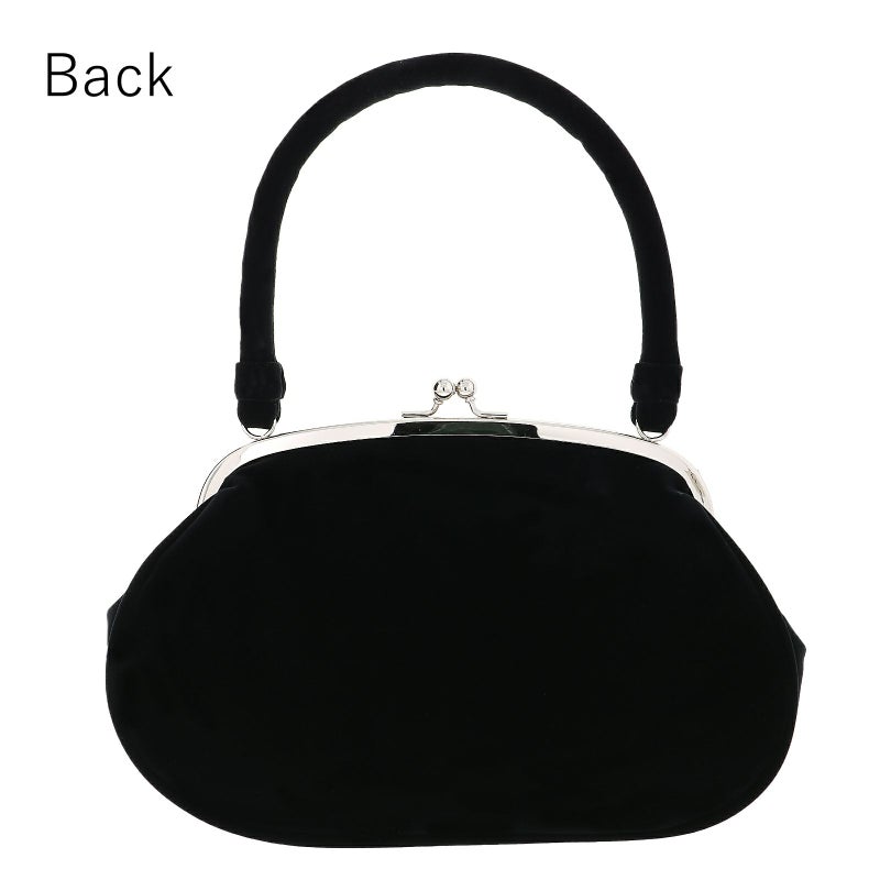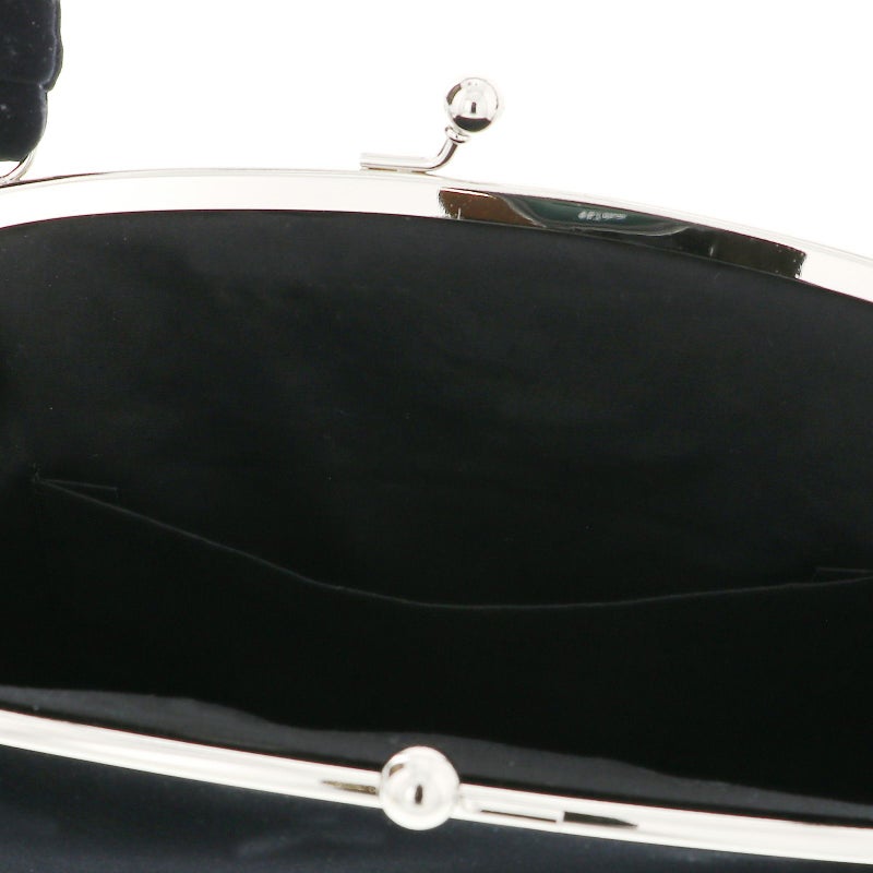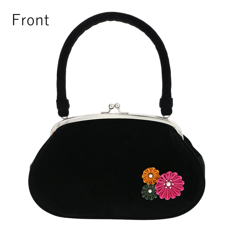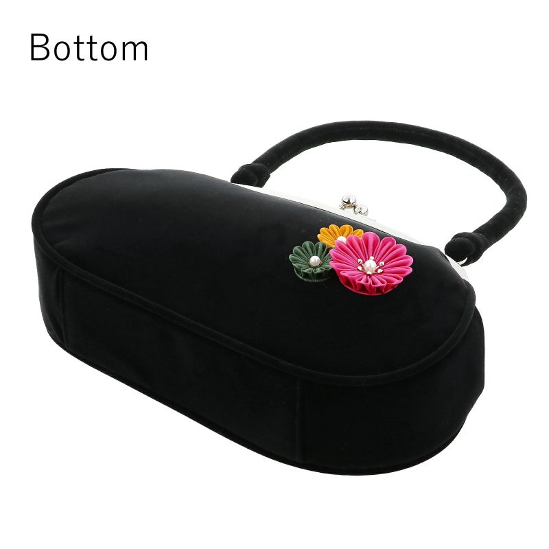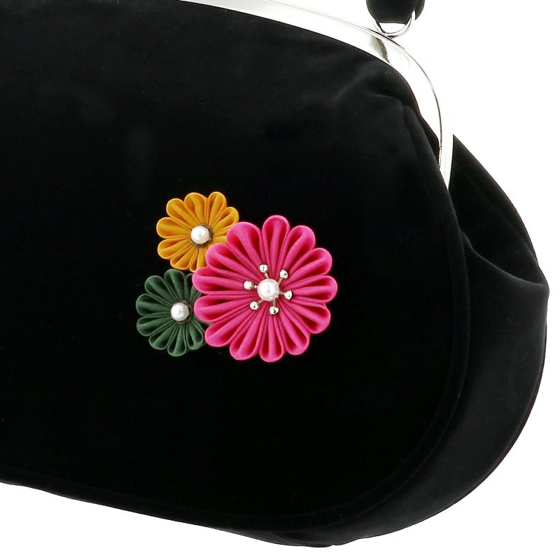 【カラー】バッグの持ち手と本体は黒のベロア地。深いピンク、深緑、からし色にパールビーズのつまみのお花。口金はシルバー。草履の鼻緒は黒地に深い赤紫、シルバーの刺繍、ポイントにパールビーズが施された菊の花。鼻緒の裏地は白。前坪はゴールド。台は黒の天に、芯の巻きは黒のベロア地。ゴールド、白の飾り芯。