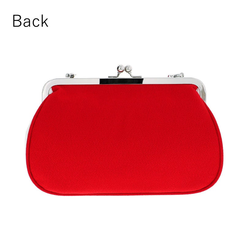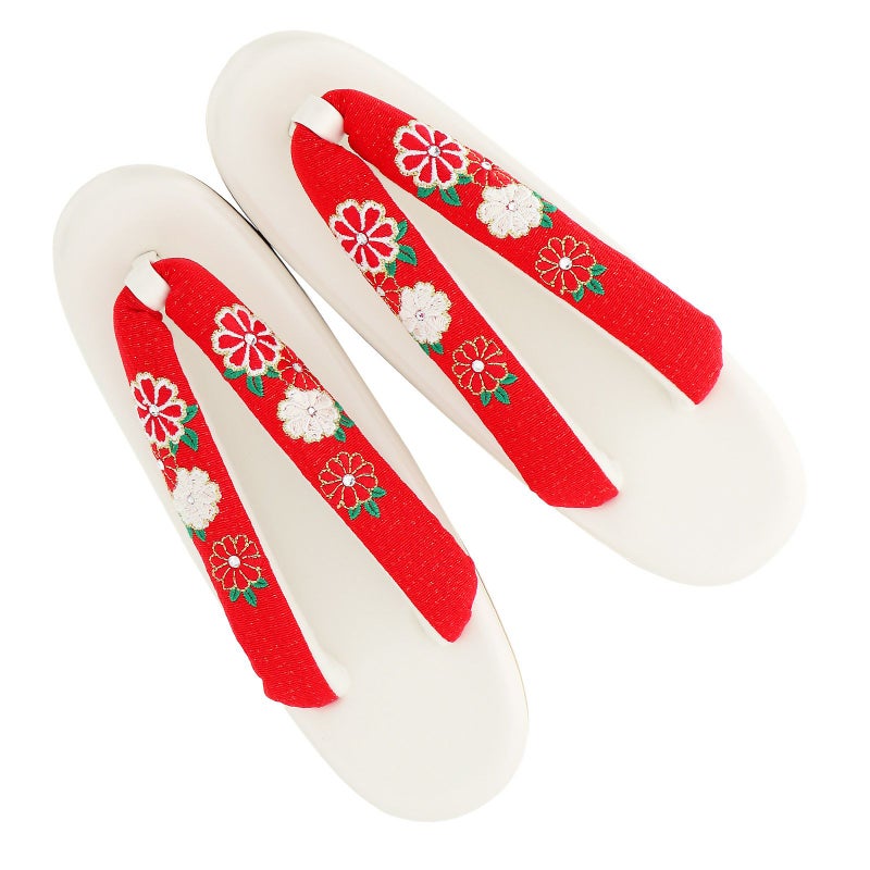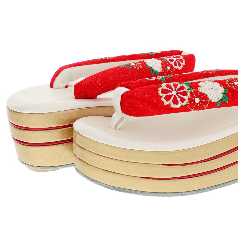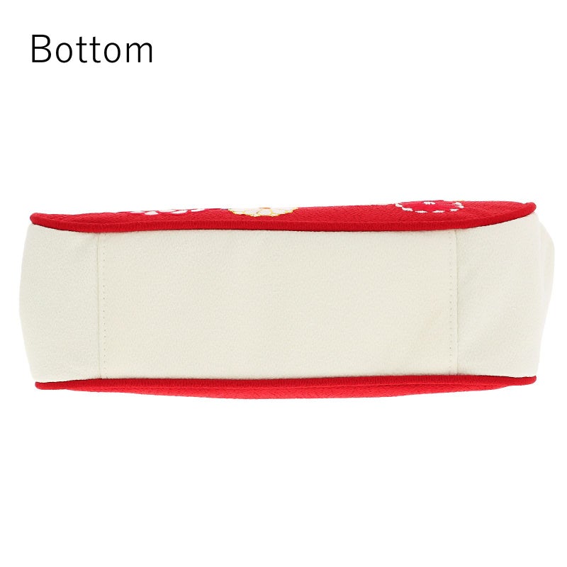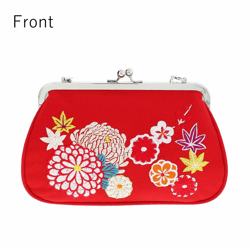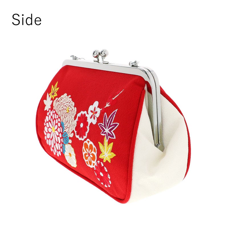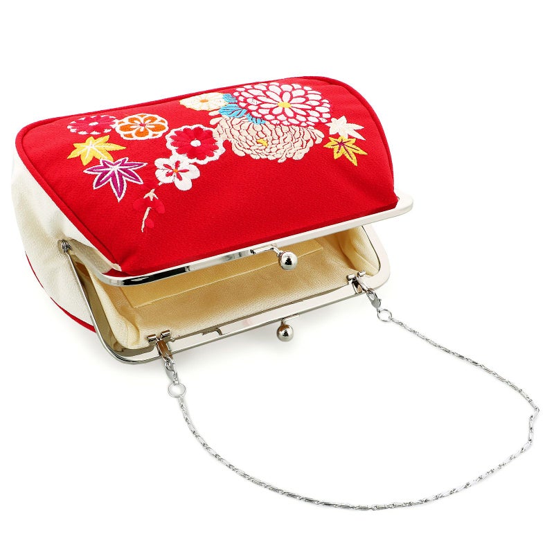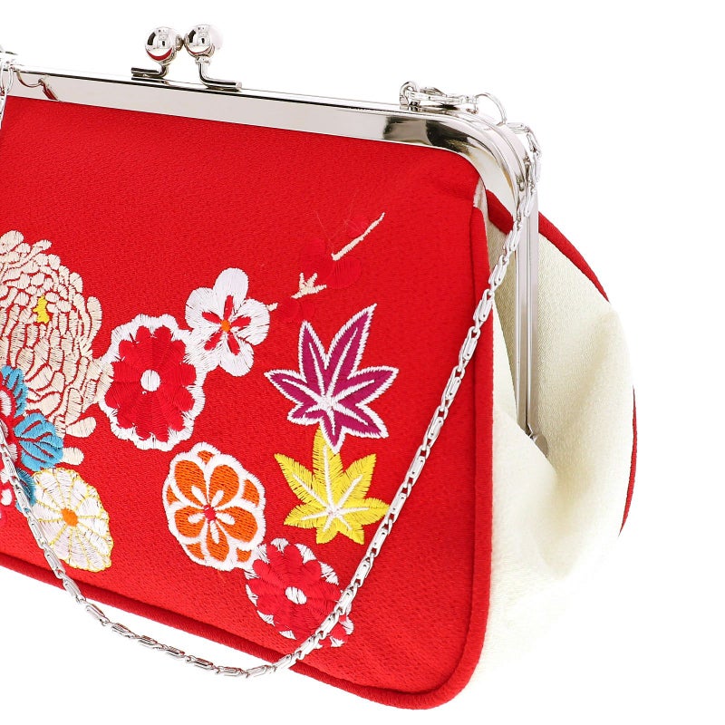 【カラー】バッグの表裏は赤地。側面はオフホワイト。白や赤、水色、黄色、紫などの刺繍で表現された菊に楓、梅。口金はシルバー。草履の鼻緒は金通しの赤地に赤白、ゴールドの刺繍、ポイントにラインストーンが施された菊の花。前坪は白。台は白の天に、芯の巻きはゴールド。赤の飾り芯。