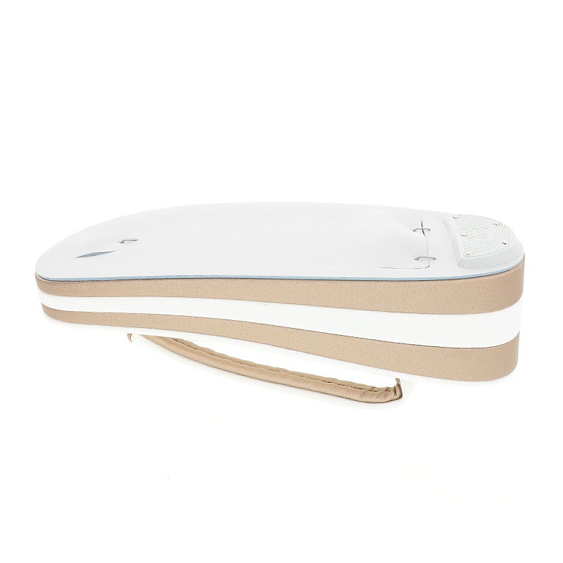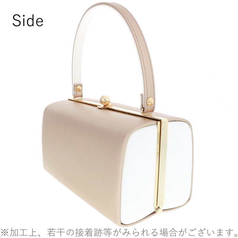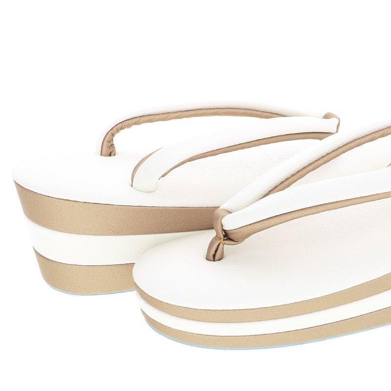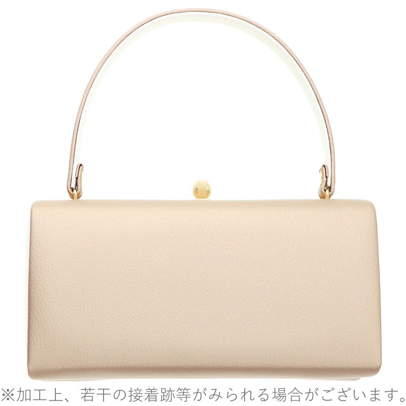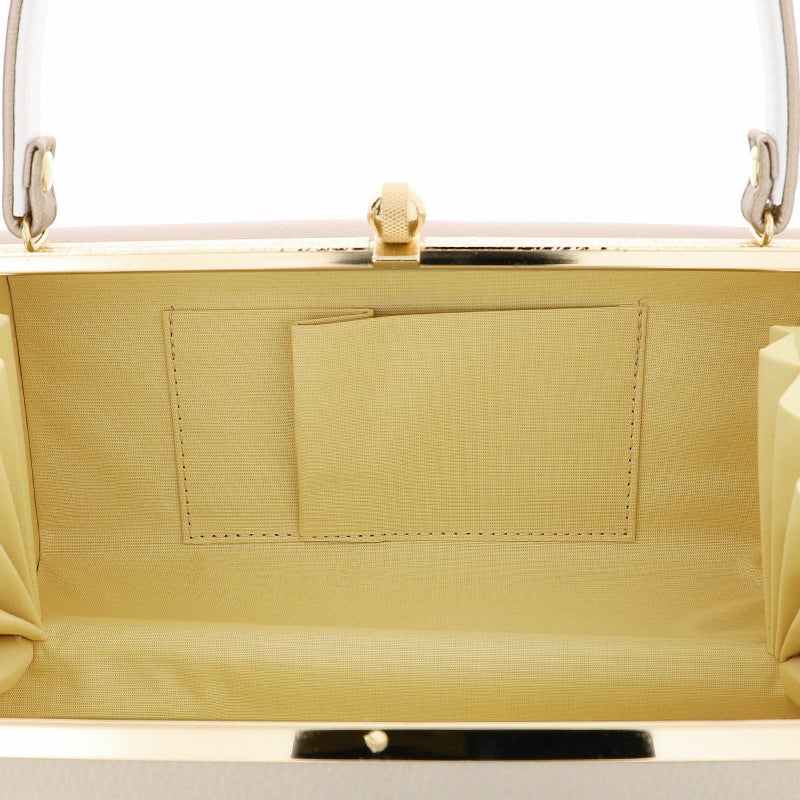 【カラー】バッグの表裏、持ち手の表はややマットなベージュゴールド。側面、持ち手の裏はオフホワイト。口金は明るいゴールド。草履の鼻緒は白。鼻緒の裏と前坪はベージュゴールド。草履の台は白の天に、三枚芯の巻はベージュゴールドと白。エンボス加工によって全体に皮革のきめが表現されており、やわらかい奥行きのある質感です。