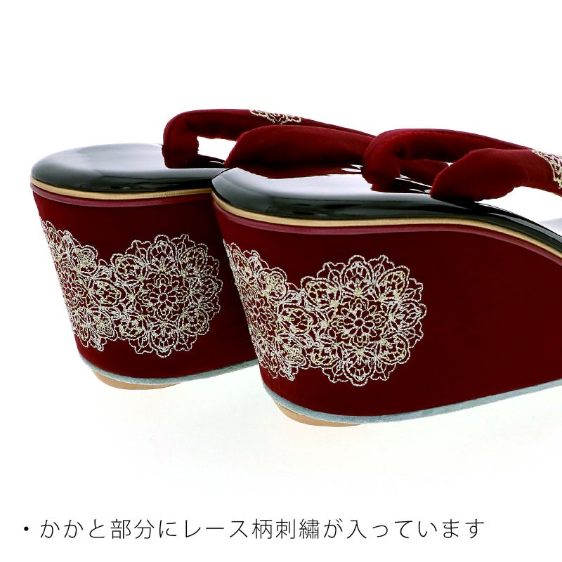 草履の鼻緒は深いワインレッドの地にゴールドとシルバーのレースモチーフの刺繍にラインストーン。前坪はゴールド。草履の台は黒のエナメルの天に、芯の巻はワインレッド地にレースモチーフの刺繍。ウェッジソールのような楔形の台です。