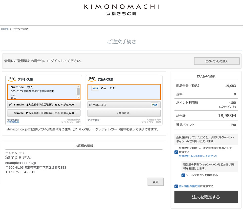 きもの町の会員として登録されていない場合、ログインして購入するか、ログインせずに購入するかを選択する画面が表示されます。
