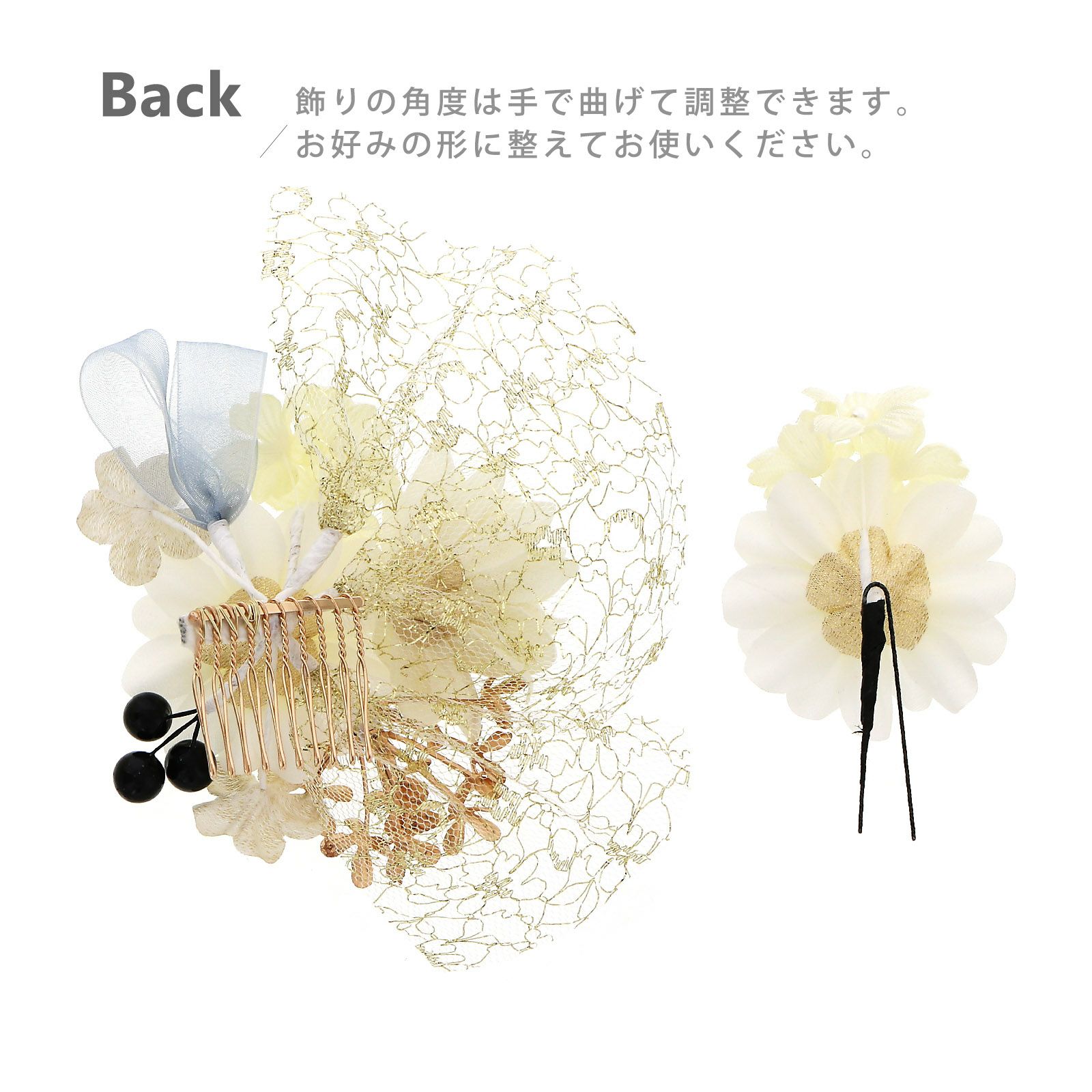 他の画像を見る 成人式の振袖に、卒業式の袴にも 華やかな髪飾り (成人式・卒業式10%OFFCP11/27迄)成人式 髪飾り Uピンの2点セット「ゴールドベージュ・シルバーホワイト 透かしフラワー、リボン」日本製 振袖用髪飾り お花髪飾り 成人式 卒業式 結婚式 着物【メール便不可】 きもの町価格 ¥ 4,180 税込 カートに入れる お気に入りに登録する