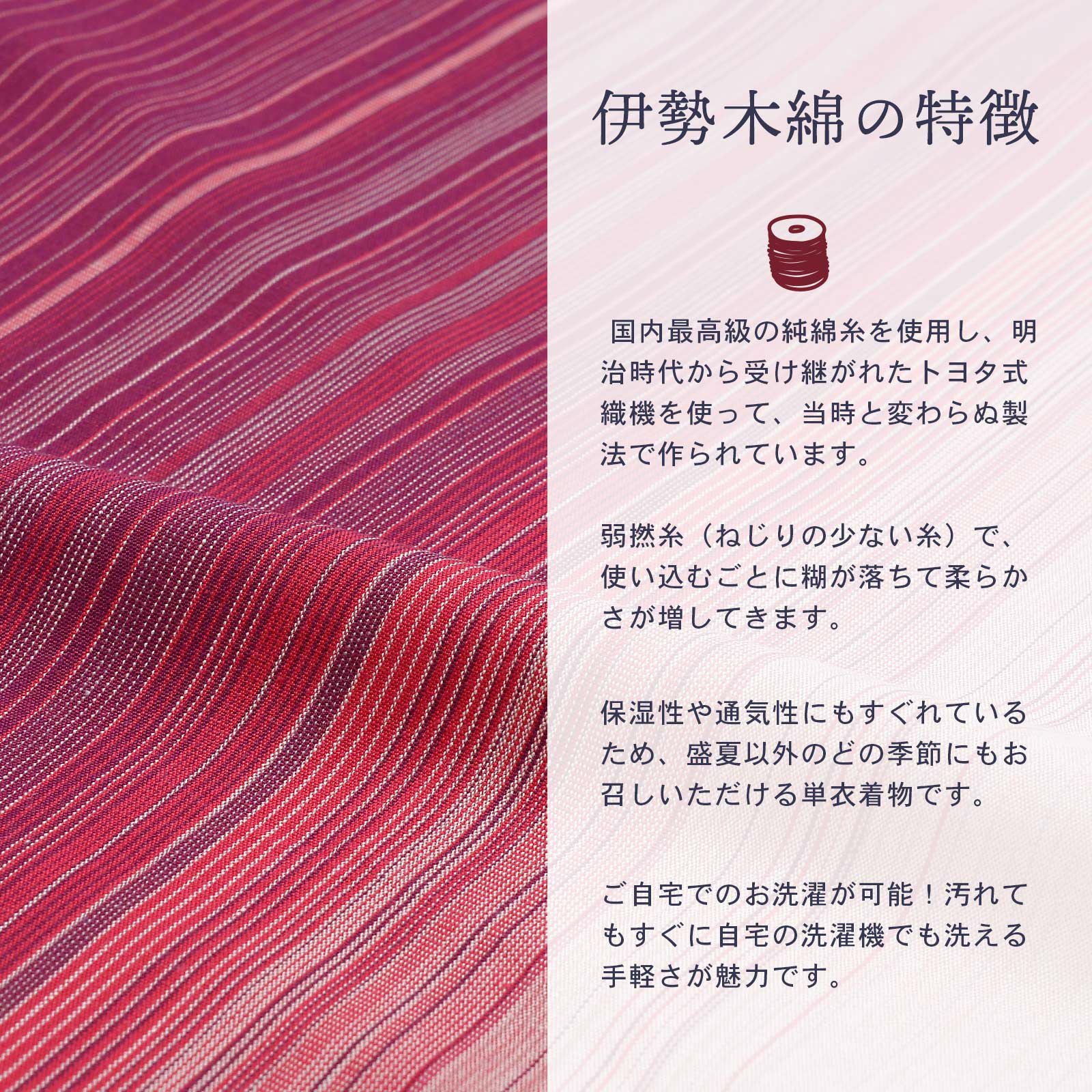 他の画像を見る 送料無料 やわらかく、どこかぬくもりが感じられる「伊勢木綿」の未仕立て着物 反物 伊勢木綿 洗える着物 反物 レディース「滝縞 赤紫×ピンク」未仕立て 木綿きもの 日本製 三重県 伝統工芸品 単衣 綿 カジュアル 小紋 レディース【メール便不可】 きもの町価格 ¥ 39,600 税込 カートに入れる お気に入りに登録する
