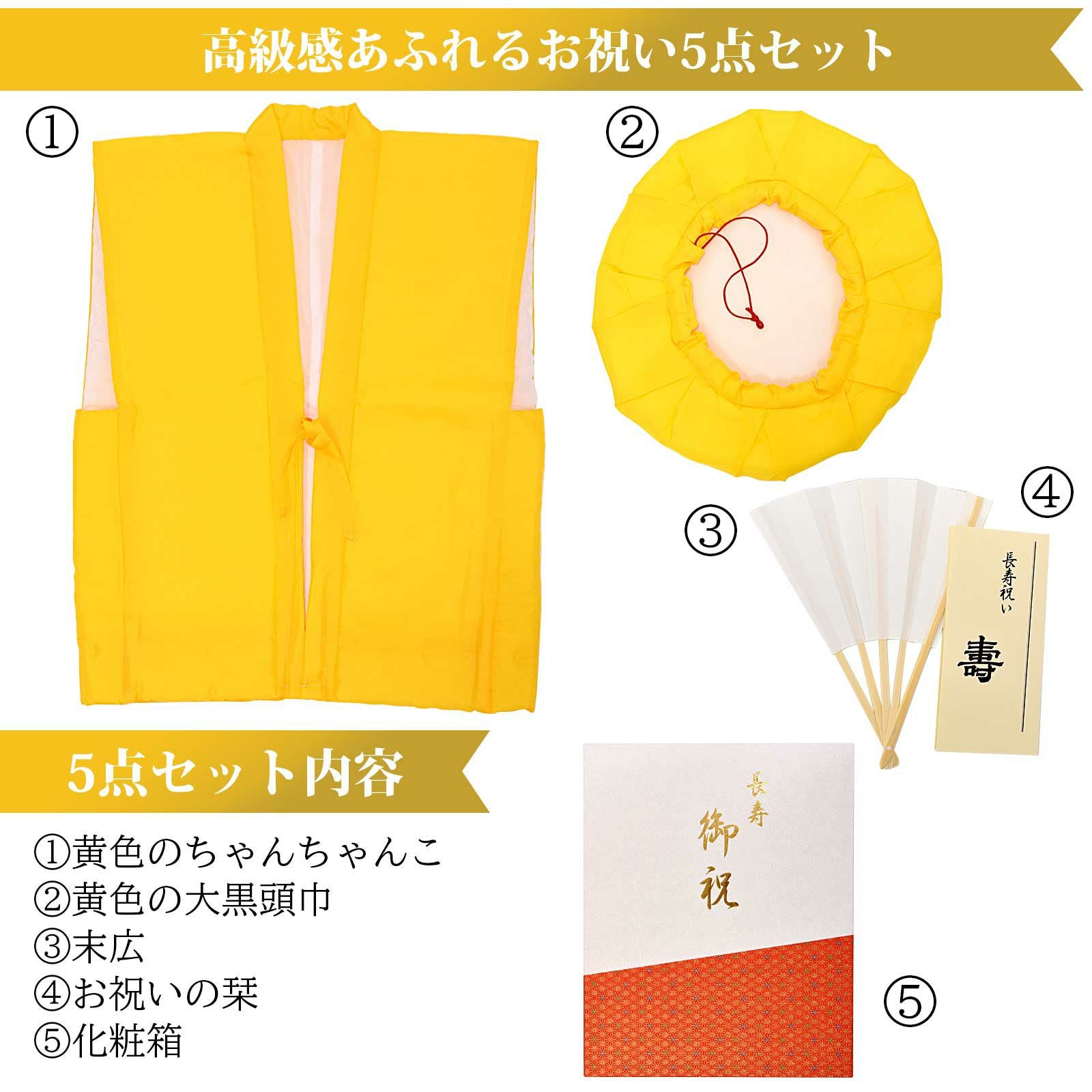 他の画像を見る 送料無料 長寿のお祝いに 黄色のちゃんちゃんこと頭巾のセット 「日本製 本格高級ちゃんちゃんこセット 黄色」 長寿祝い 5点セット 傘寿 米寿 卒寿 80歳 88歳 90歳のお祝いに 長寿お祝い 御祝い 化粧箱入り 男女兼用 ラッピング無料 熨斗無料 敬老の日 ギフト プレゼント【送料無料】【メール便不可】 きもの町価格 ¥ 12,100 税込 詳細を見る お気に入りに登録する