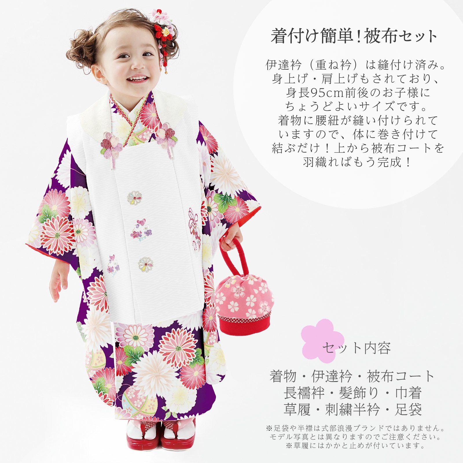 他の画像を見る 送料無料 3歳の女の子の七五三に 個性的で大人っぽさがかわいいブランド着物フルセット 七五三 着物 3歳 ブランド被布セット NATURAL BEAUTY (ナチュラルビューティー) 「パープル BF-2」 女の子 被布コート 6点フルセット 足袋プレゼント12~18cm レトロ着物セット 3才 女児用 三歳被布セット 子供着物 三才のお祝い着 3歳向け 【メール便不可】 きもの町価格 ¥ 107,800 税込 在庫切れ カートに入れる お気に入りに登録する