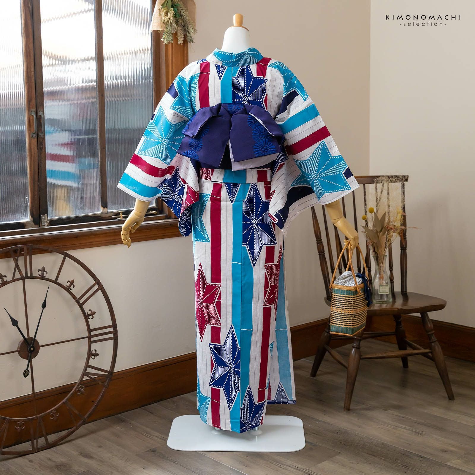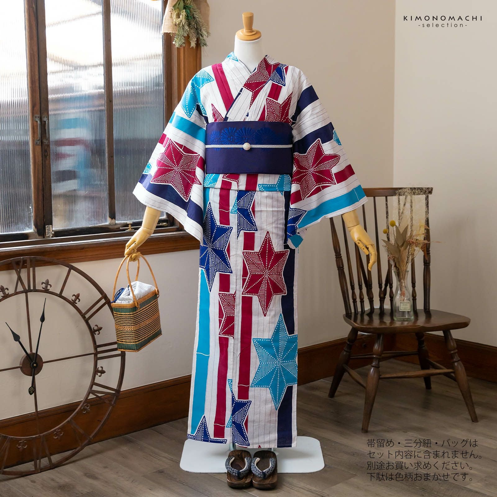 他の画像を見る コーディネート済の浴衣と帯におまかせ下駄がついたレディース浴衣セット 【Prices down2】浴衣 セット レディース 大人 浴衣セット 浴衣3点セット(浴衣+帯+おまかせ下駄)「浴衣:青×赤×白 縞に麻の葉+帯:ネイビーブルー レトロフラワー+おまかせ下駄」 派手系 個性的 レトロモダン 花火大会 夏祭り 女性用浴衣 女性浴衣 ゆかた yukata 【メール便不可】ss2506ykl10 通常販売価格 ¥ 9,900 のところ きもの町価格 ¥ 8,009 税込 在庫切れ カートに入れる お気に入りに登録する