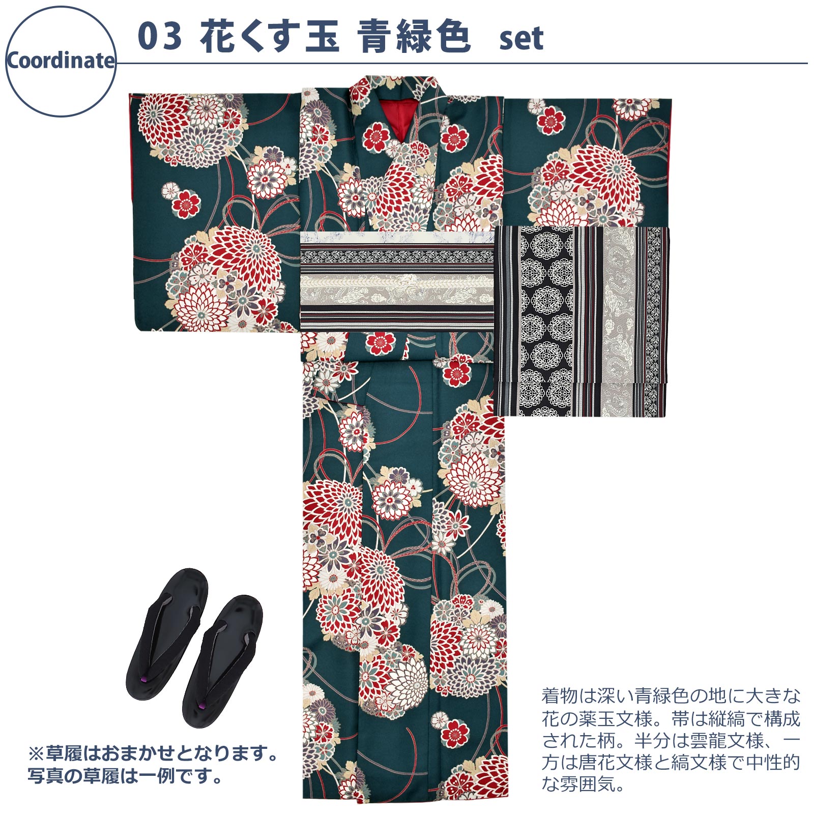 袷着物+京袋帯+帯揚げ+帯締め+草履のセットです。