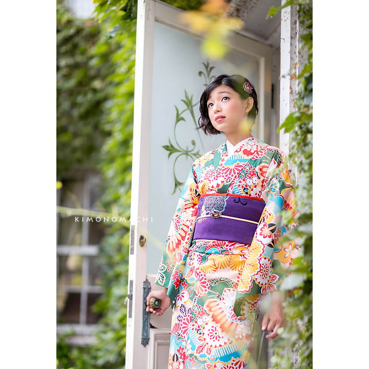 深緑色地の全面に描かれた古典花柄。落ち着いたトーンの地色に、重なり合うように描かれた菊や松、橘、葵の柄が、豪華な雰囲気。柄に使われている赤や白、黒、山吹などの色使いもキレイです。
