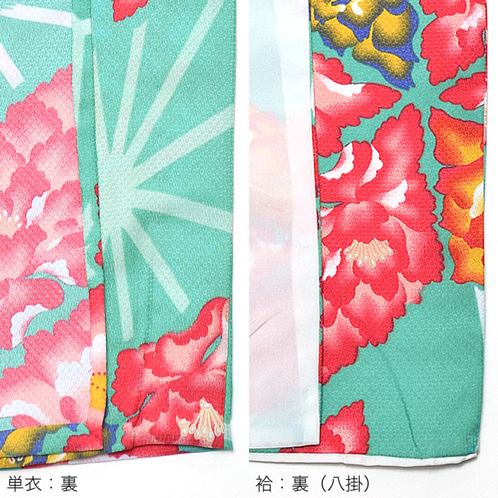 明るめの青緑色地に、薄緑色の麻の葉模様のラインと、その上に配置された菱形のお花。ピンク系とブルー×黄色の大小のお花には、ダイナミックながらも、どこかロマンティックなムードが漂っています。