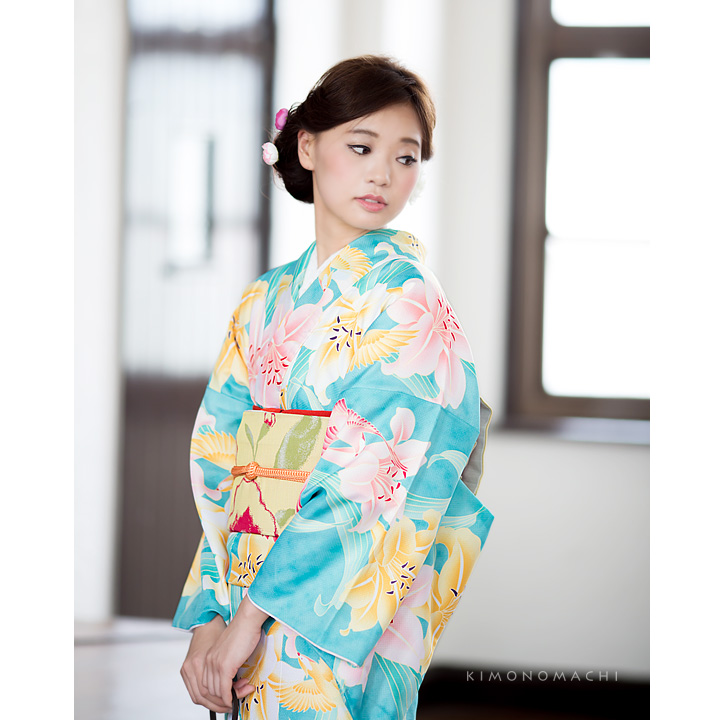 濃淡のぼかしのタッチの青緑色地に、黄色、ピンクの色使いの鳥、百合の花模様。綺麗な色使いの上品な華やかさのある雰囲気。