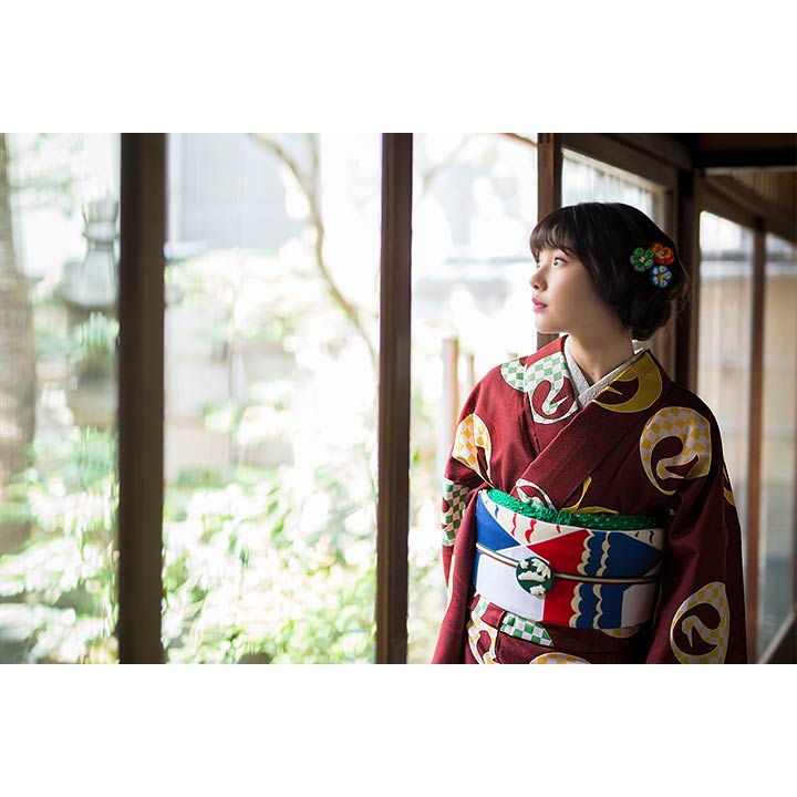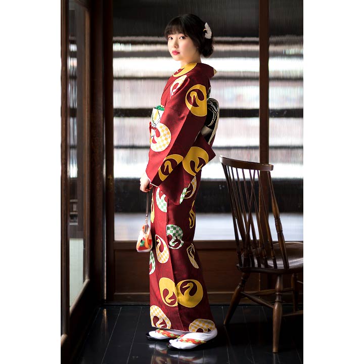 エンジ色地に、ワントーン明るい色でさりげなく、麻の葉、立涌文に花、縦に連なる梅の花模様。その上に、濃い黄色や、黄色×白色、明るい緑色×白色でくっきりとキレイに浮かび上がっている、丸い鶴のモチーフが目を引きます。