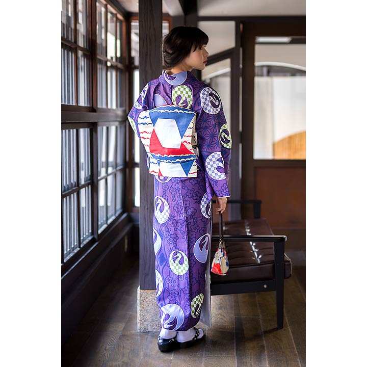青藤色地に、青色ラインの麻の葉、立涌文に花、縦に連なる梅の花模様入り。その上に、薄紫色や、柳緑色×白色、薄紫色×白色でくっきりとキレイに浮かび上がっている、丸い鶴のモチーフが目を引きます。