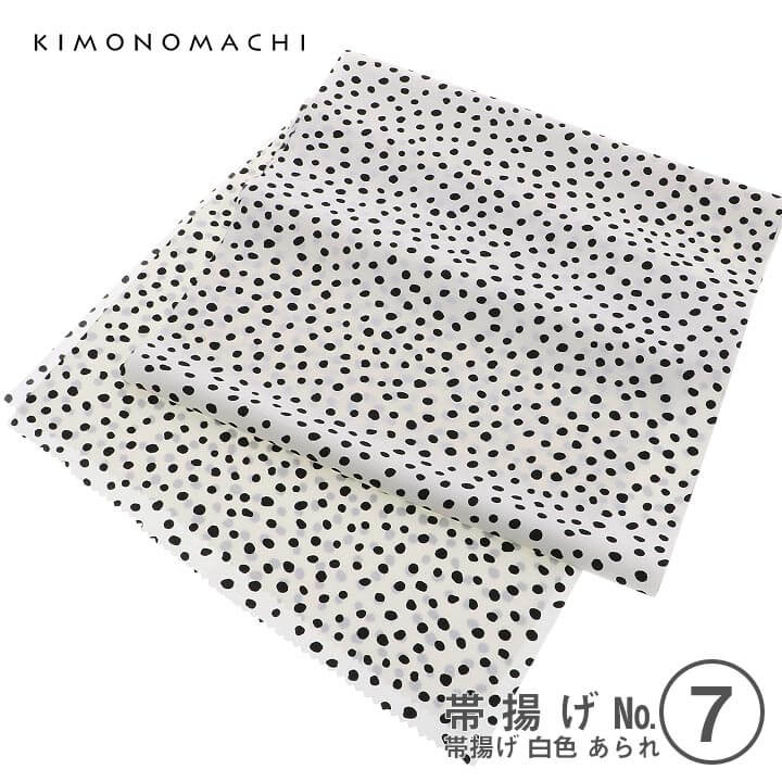 シンプルなデザインで合わせやすい、カジュアルな帯揚げ。わずかに生成りみを含んだ柔らかな白地に、黒色のあられ模様入り。