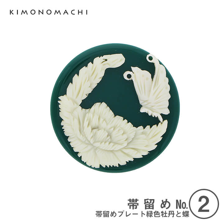 こっくりとした濃いめの緑色のプレート台に、生成り色の蝶と牡丹の手彫りパーツが配された帯留め。存在感のある大きめサイズ。使いやすいクリップタイプ。