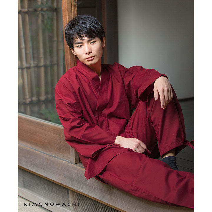 綿ポリ素材の作務衣です。上着、ズボンの上下に分かれています。