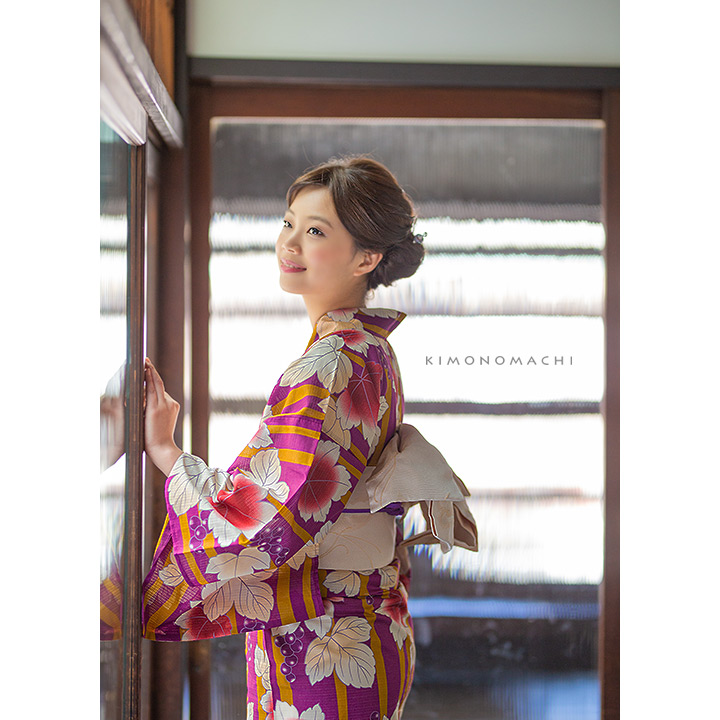 紫色地に、金茶色のナチュラルな縦ライン。その上に、ごく薄い藤色のラインで縁取られた葡萄蔦模様。葉っぱの部分はアイボリーで、部分的にほんのり濃く、また濃淡のエンジ色で色づいています。赤紫色の葡萄がぷっくり丸くて、可愛らしい。キレイ系レトロモダンなムードで着こなしたい浴衣。浴衣の縦ラインに近いカラーの、ベージュの帯をあわせて、大人な雰囲気にまとめると素敵。